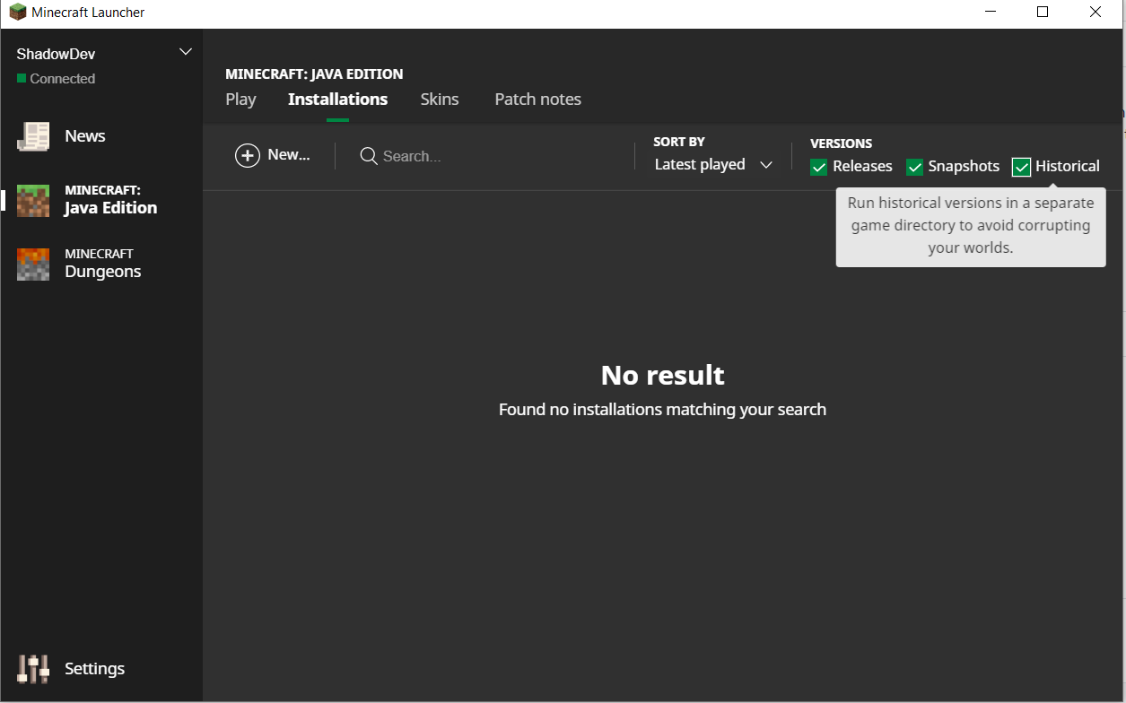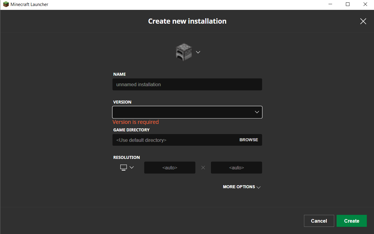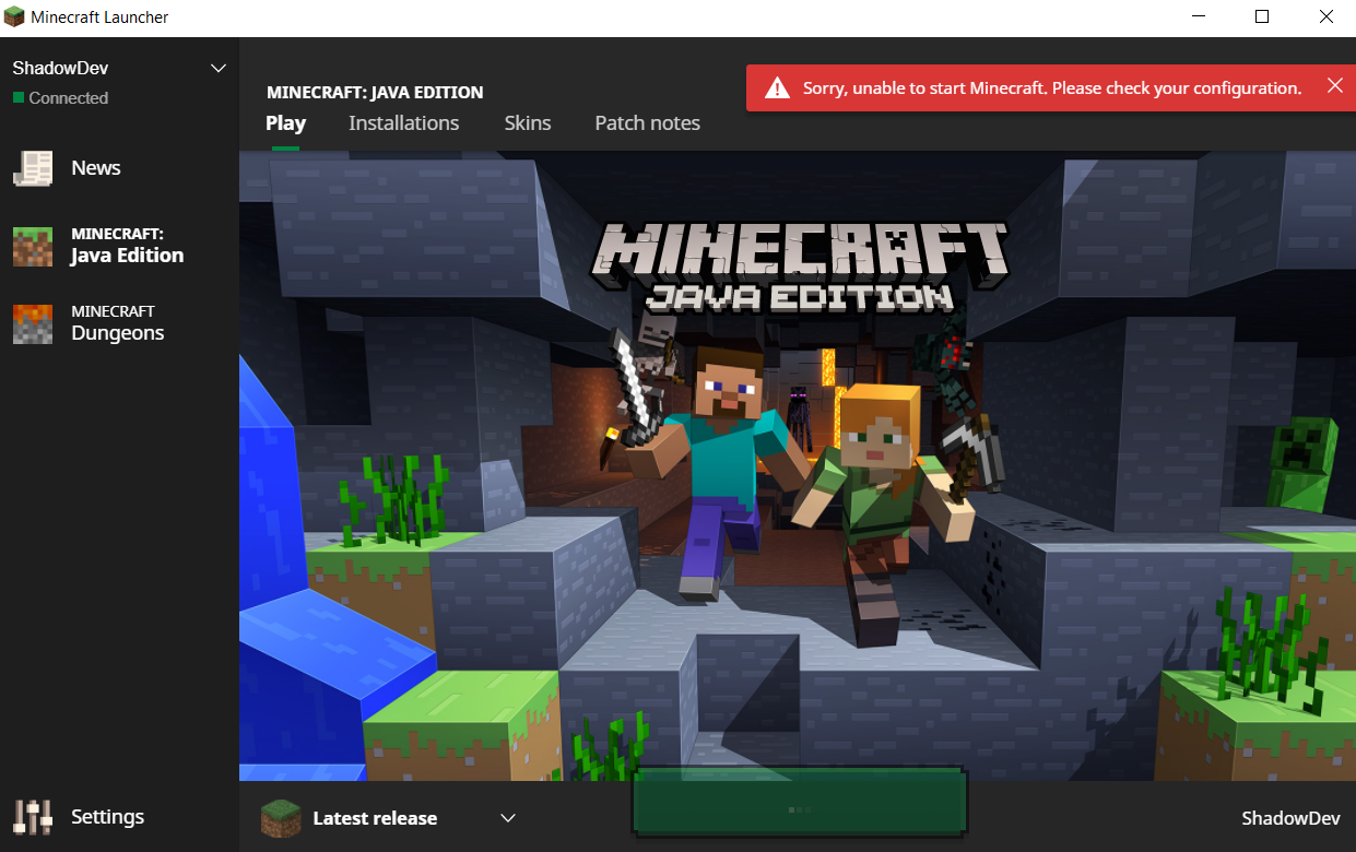 When I click the dropdown menu to select a version to use for the installation, nothing happens. The default installations are not listed in the installations menu either, and when I try to start the game with either of these installations selected, I get an error saying to check the configuration.