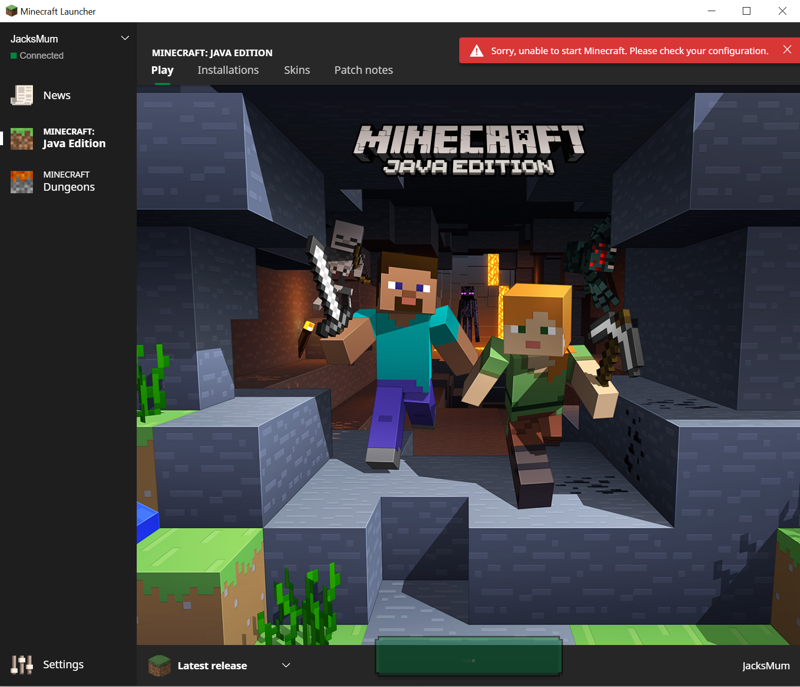 every time i try to click play i get an error messege 'Sorry, unable to start Minecraft. Please check your configuration'