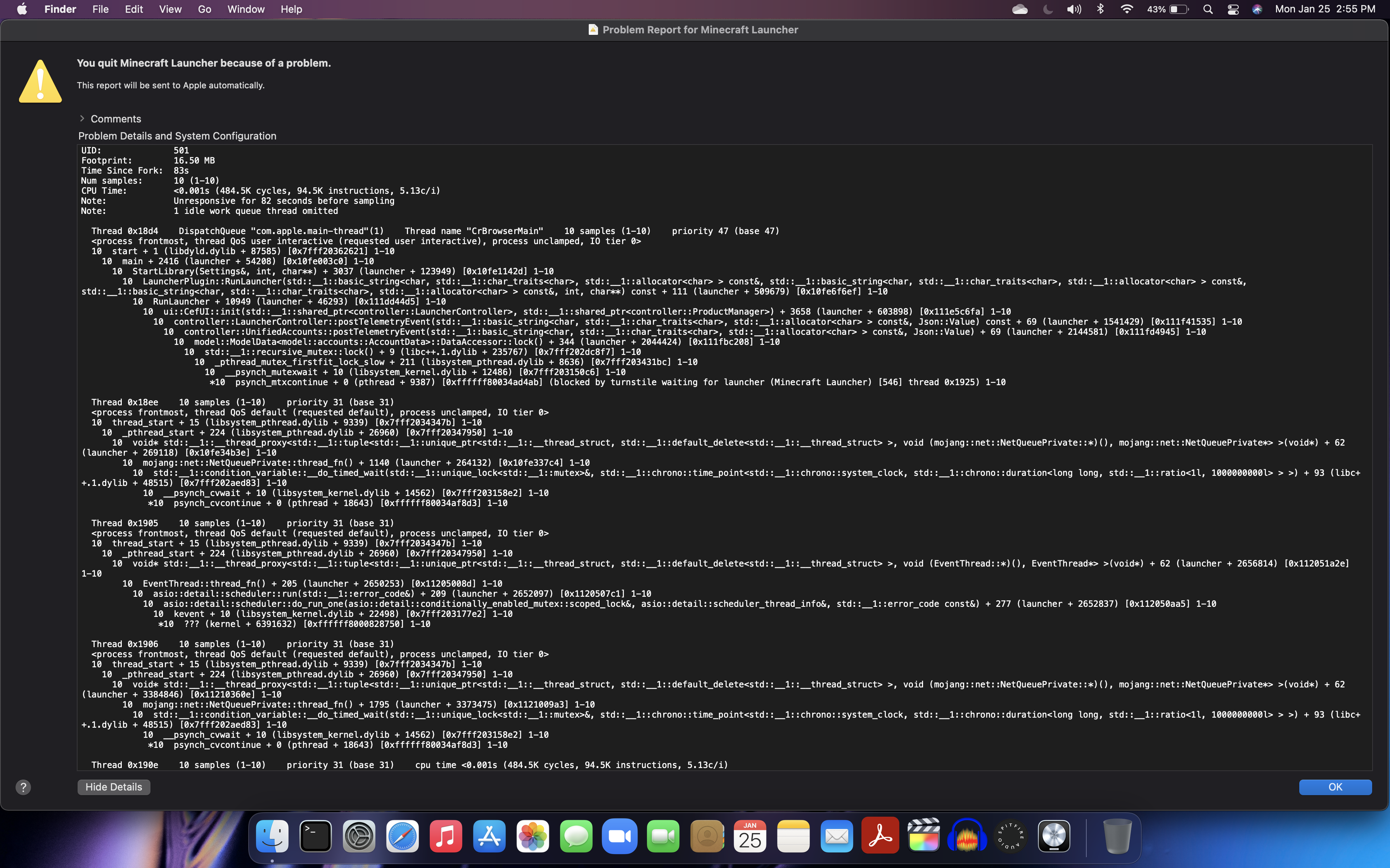 I had installed and launched Minecraft successfully one time. Mid-play my laptop battery died and shut down the computer. The next day I go to open up the game and the launcher does not respond. It does not open at all. I have tried all solutions: Checking for incompatible software (I have none from what is listed), tried alternate launchers, reinstalled the game and restarted the computer many times, used different browsers to download, and have tried finding any of the game files in /Application Support/minecraft but the folder and any other Minecraft folders don't exist so I'm not able to do anything with that. On a friend's computer they also don't have these folders and the game is running fine so that is not the issue. I know there are similar threads but they are for Windows and the solutions listed have not solved this issue for me and others.Β