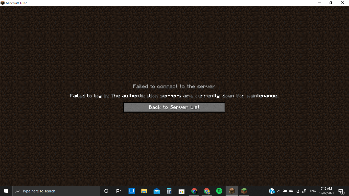 Whenever I launch the game and go to the page the list of servers come up on, it doesn't show up. If I try direct connection it says "Failed to log in: the authentication servers are currently down for maintenance.
