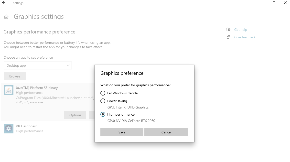 Open the settings application and navigate to graphics settings (System -> Display -> Graphics Settings)