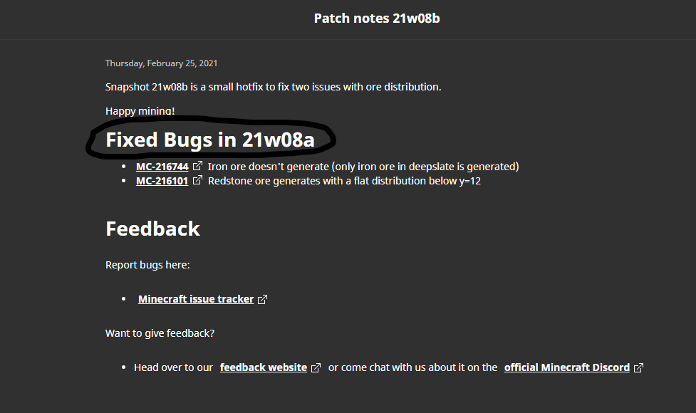 In the new 21w08b bugfix change update, the patch notes still say 21w08a.