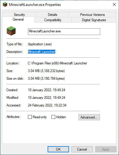 MinecraftLauncher.exeRight-click to access the Properties dialogue