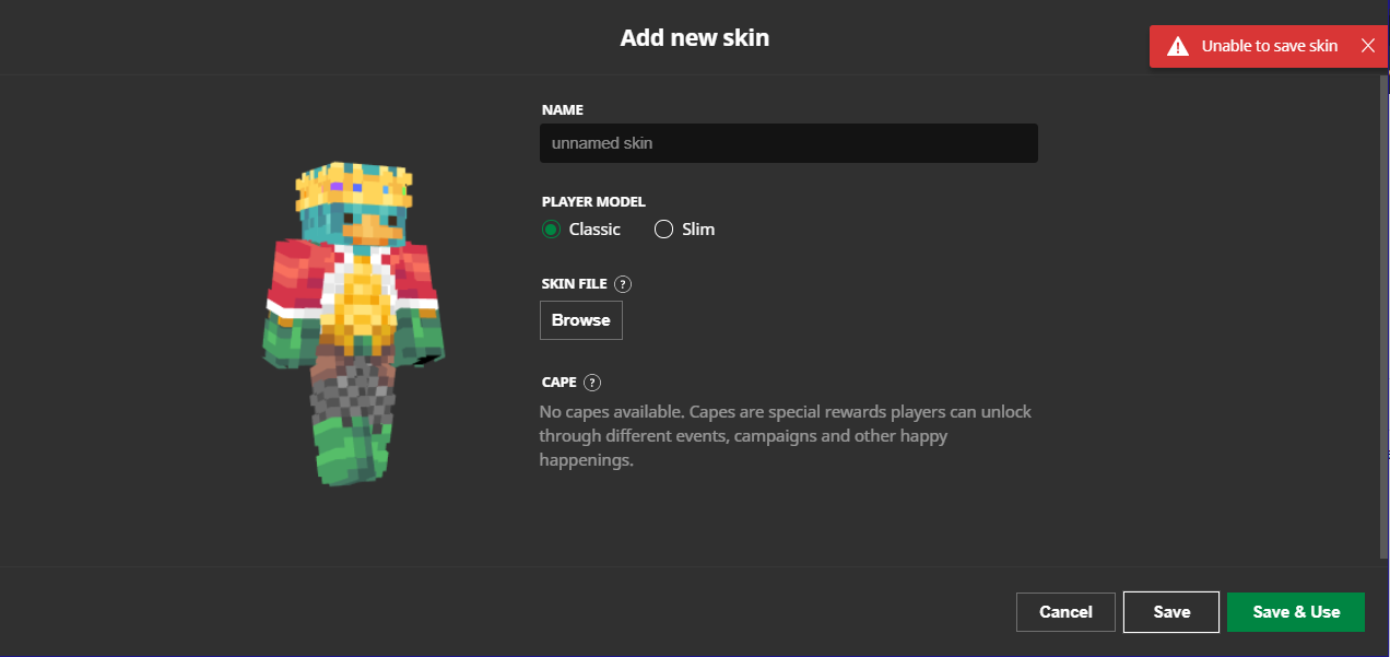 Every time I attempted to save a skin I get the error "Unable to save skin" I have been getting it for a few days now with no solution