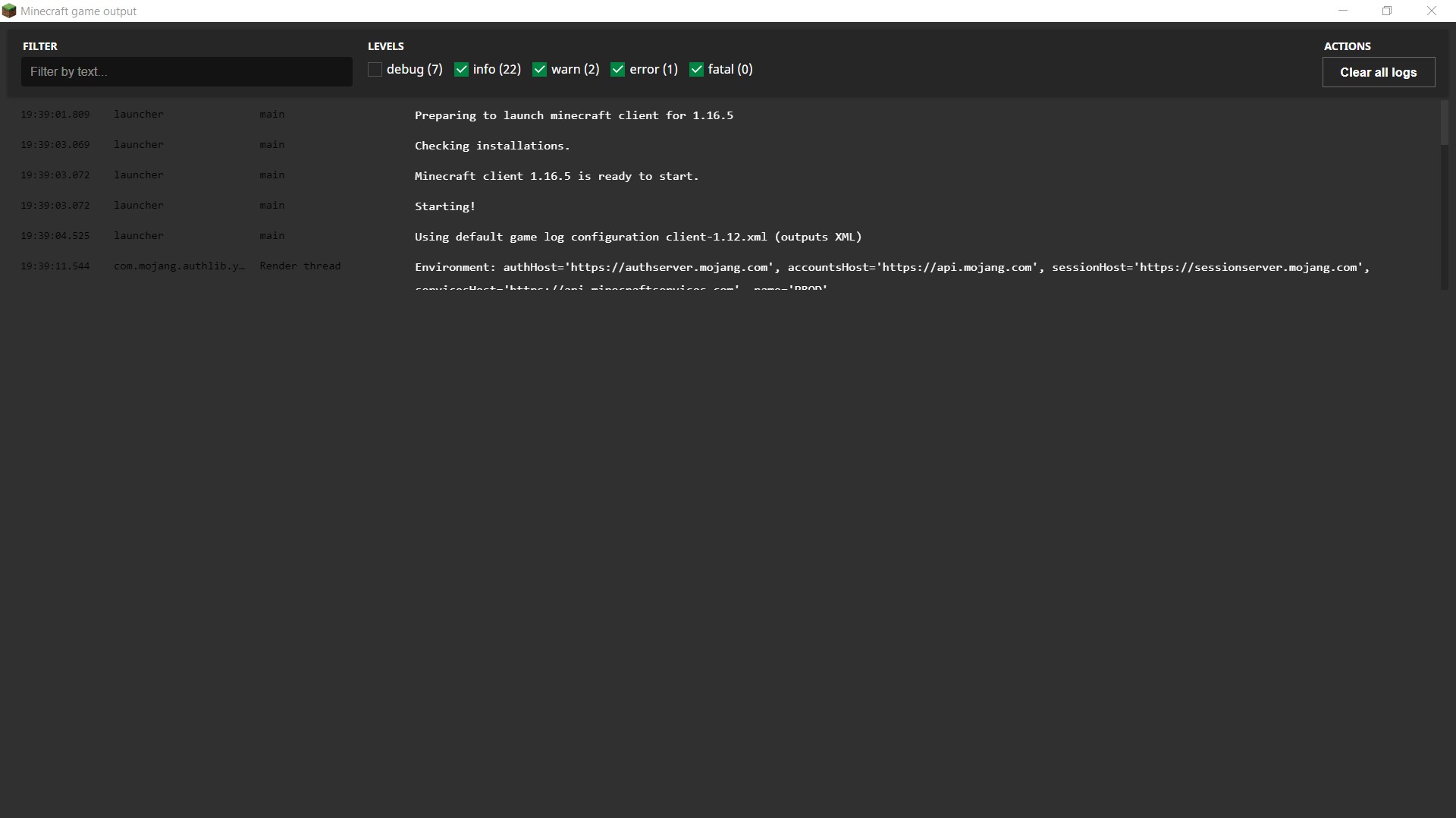Whenever I launch Minecraft with "Open output log when Minecraft: Java Edition starts" enabled, the window appears but compresses the debug messages into the upper third of the interface.