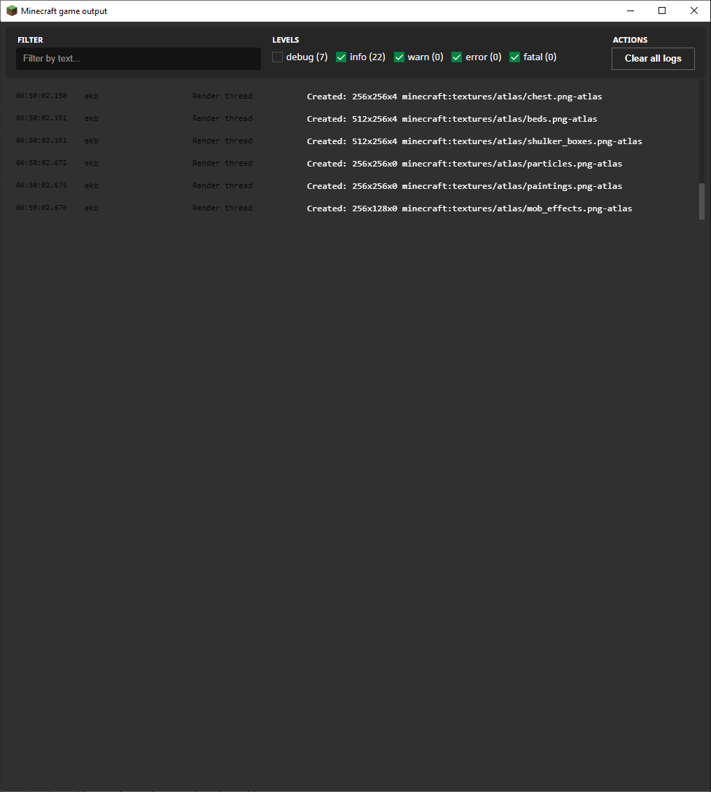 When launching Java Edition v1.16.5, with Game Output window enabled (and left open), the area for the log output is restricted, and does not match the window size. Resizing the window has no effect.