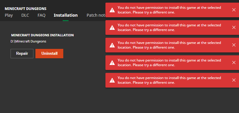 After updating my game for the 1.9.3.0 patch, the error message 'Launching the game failed; Unable to run program' popped up. so I tried to uninstall the game and install it back again, but now the launcher does not allow me to install the game at the location I want - which is a new folder I made in the D: drive, following the message: 'You do not have permission to install this game at the selected location. Please try a different one'. I am unable to play nor install the game at the moment.