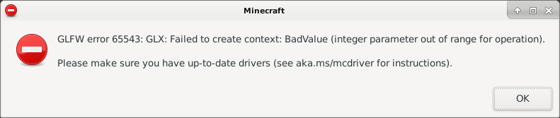 Failed to create window: dpq$a: GLFW error 65543: GLX: Failed to create context: BadValue (integer parameter out of range for operation)