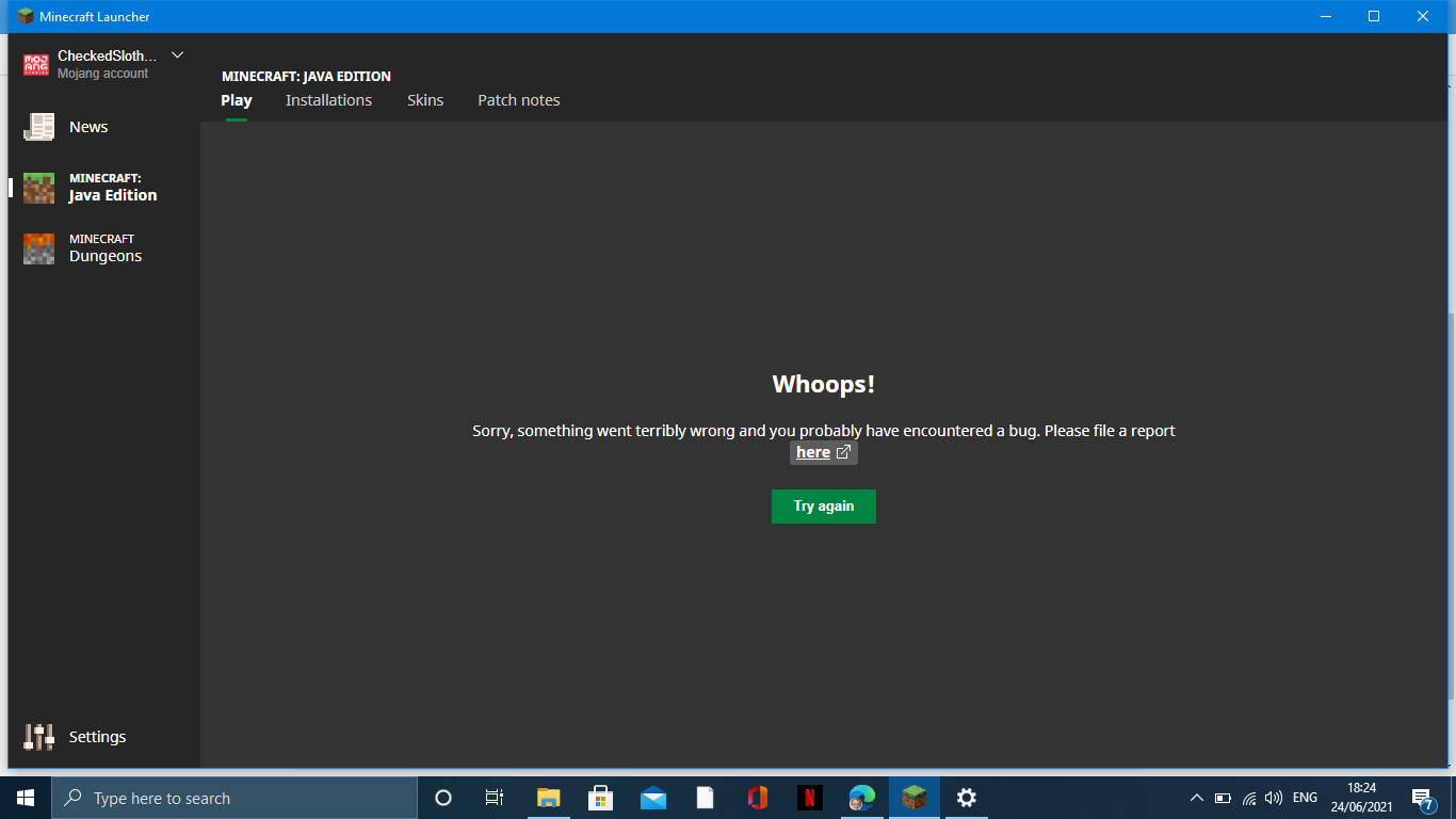 The Minecraft launches says there is a bug and won't let me start the game.