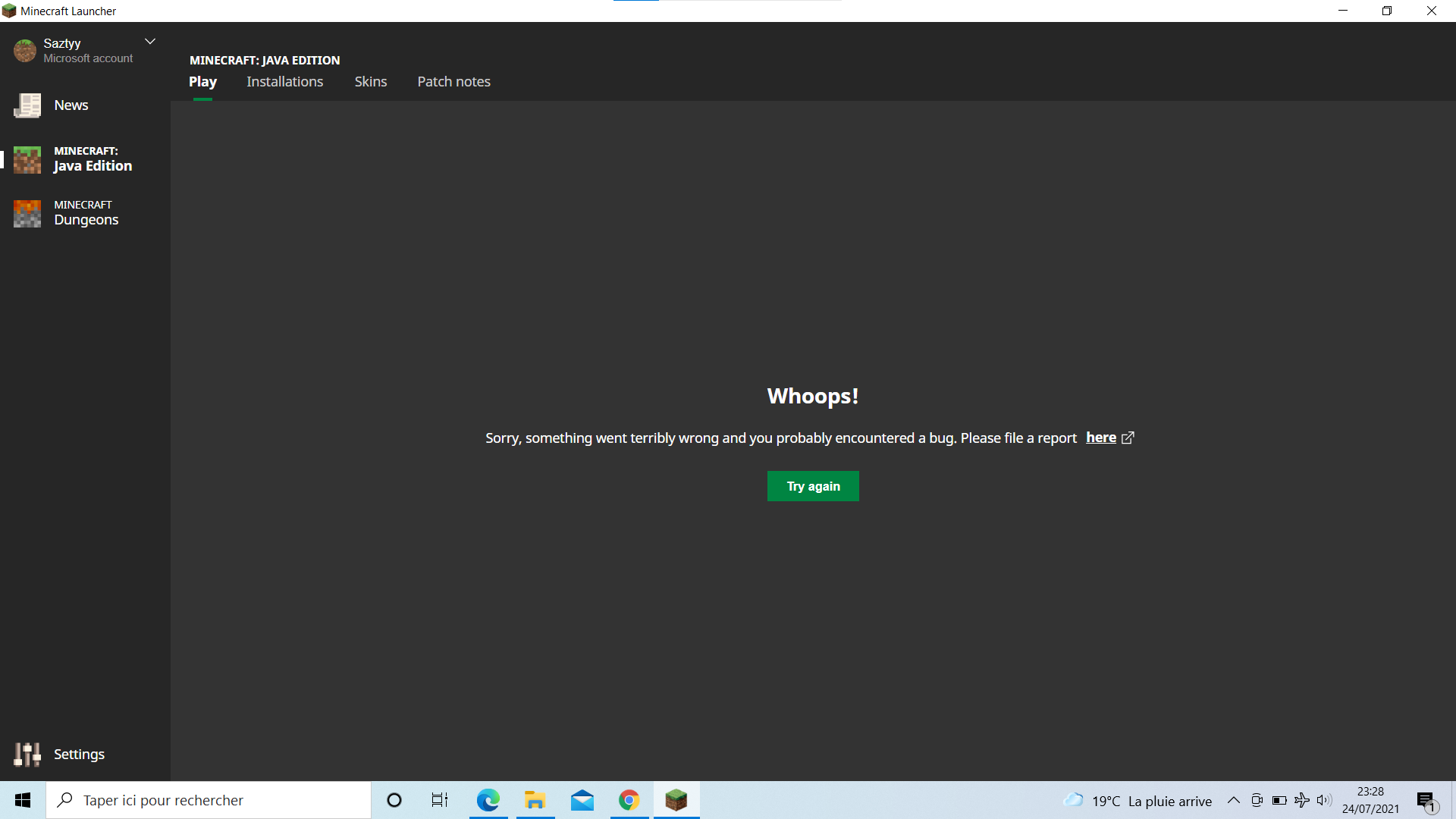 I bought minecraft java and installed it on my computer but there isn't a launching screen to start playing and instead there is a message saying that I probably encountered a bug and to report it here. The launching screen for minecraft dungeon as well as the installations, skins and patch notes seems to be working.
