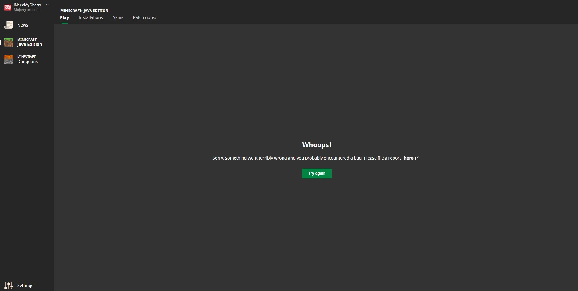 So, I tried reinstalling minecraft on my computer, and when I opened the launcher this message appeared: "Whoops! Sorry, something went terribly wrong and you probably encountered a bug. Please file a report HERE"