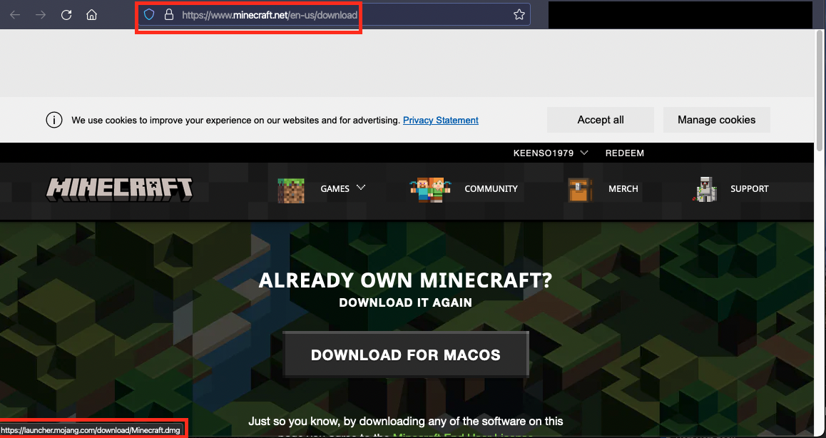 the download link on the official Minecraft download page is: https://launcher.mojang.com/download/Minecraft.dmg