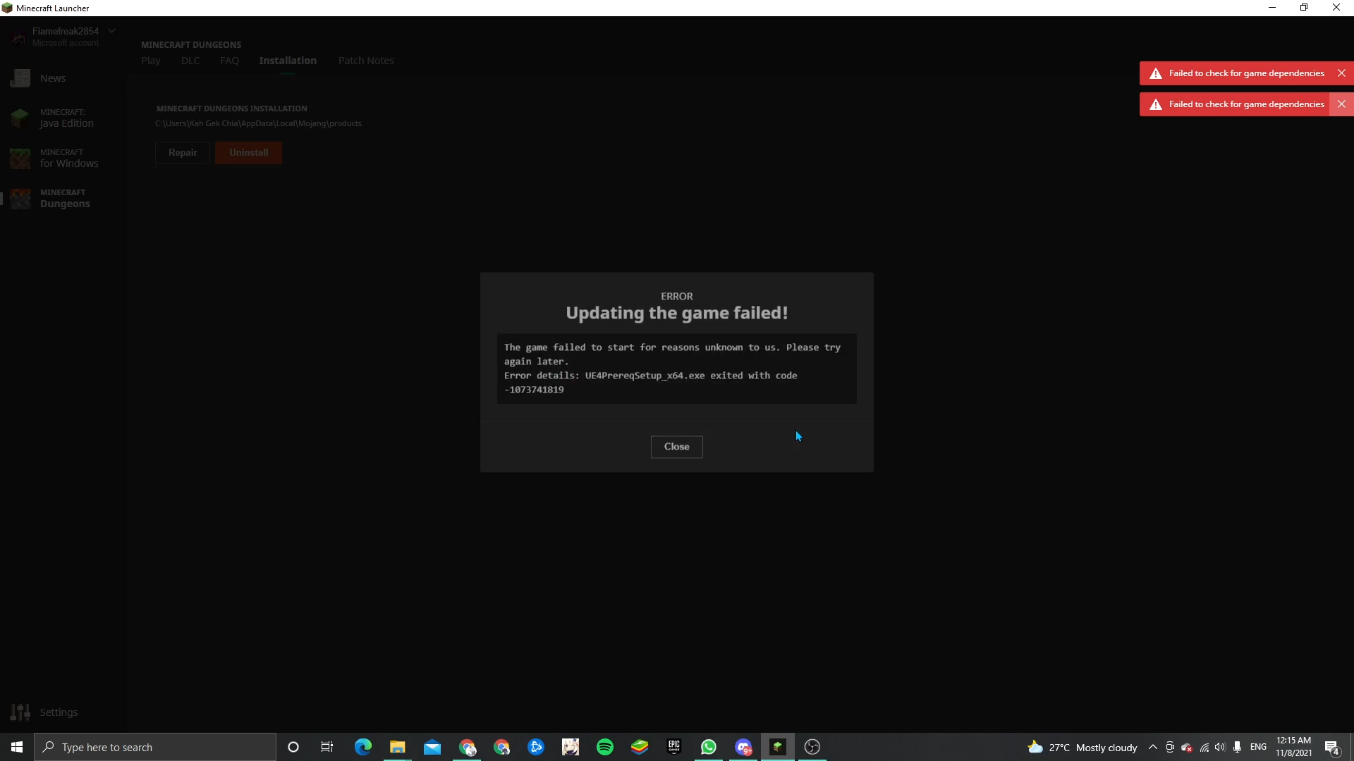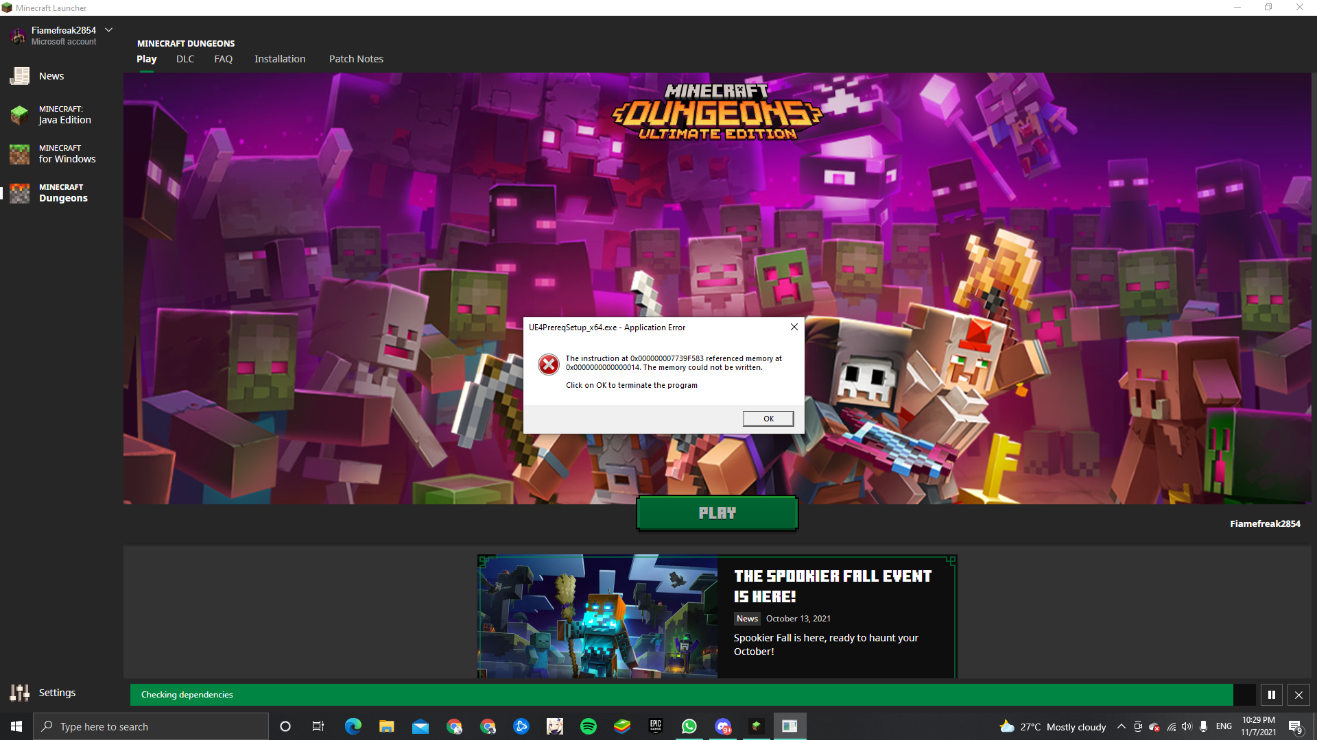 Whenever I try to install Minecraft dungeons, checking dependencies fails and I am unable to enter the game through the launcher