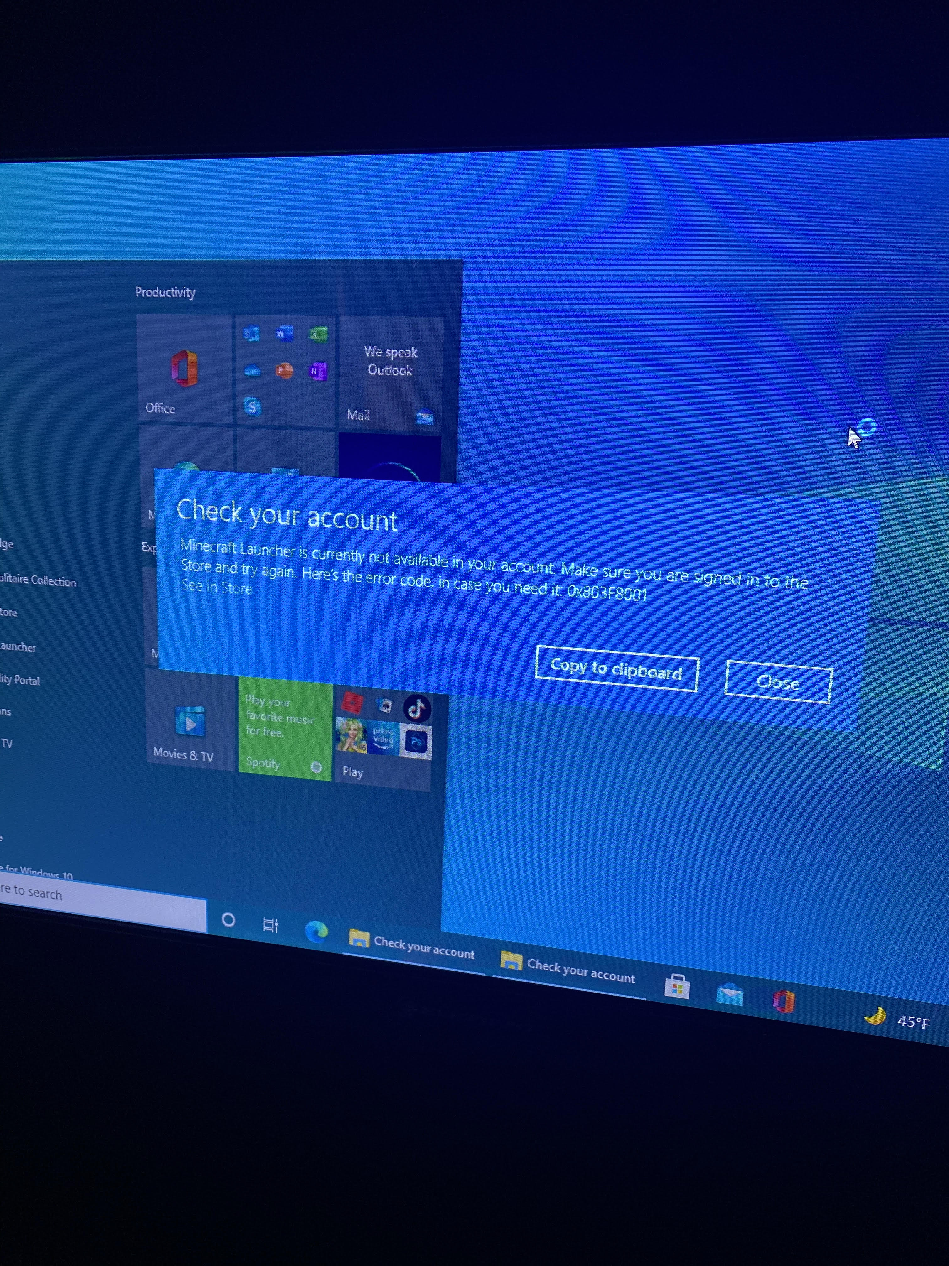 Minecraft Launcher is currently not available in your account. Make sure you are signed in to the Store and try again. Here's the error code, in case you need it: 0x803F8001