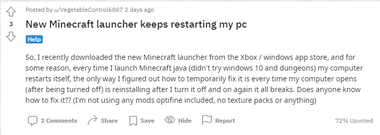 And when I tried to run the new launcher downloaded from the Minecraft.net, the launcher doesn't open, I was only able to open the launcher when I downloaded it from the Microsoft Store and the game worked normally, but today when I tried to start it (twice) my PC restarted.
