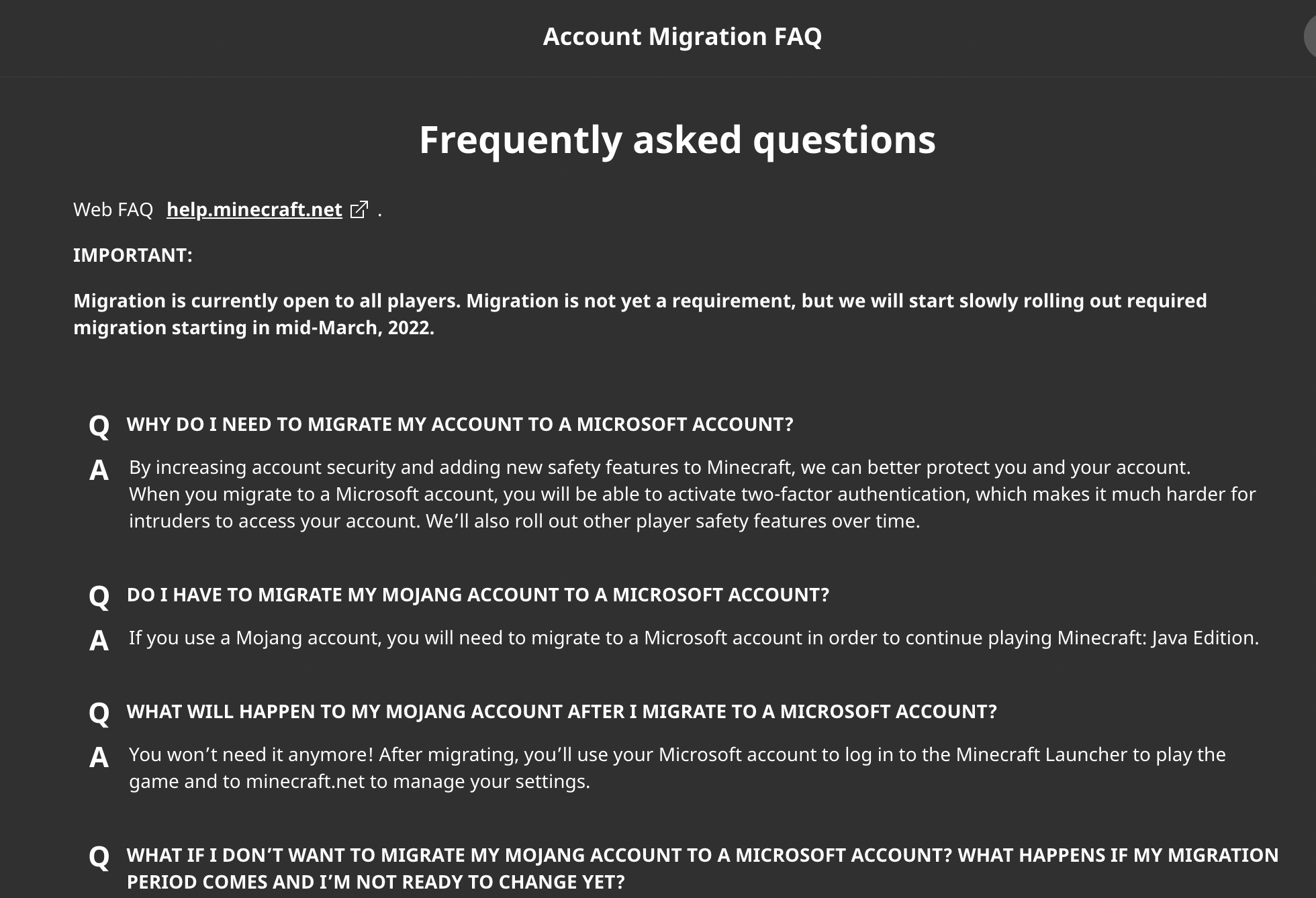 The Migration FAQ page within the Minecraft Launcher is outdated. For example, it still mentions that migration is not yet a requirement.