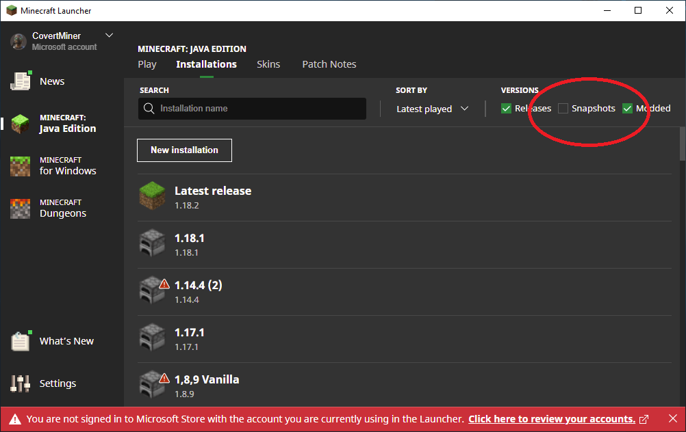 Version/Profile editor still displays Snapshot versions when the "Snapshots" checkbox is unchecked.