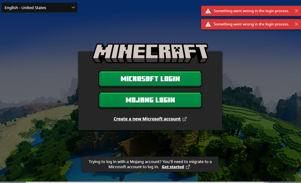 When I want to log in with my Microsoft account, I get a login window that closes as soon as it opens and a "Something went wrong in the login process" message appears at the top right of the launcher as seen in the image.