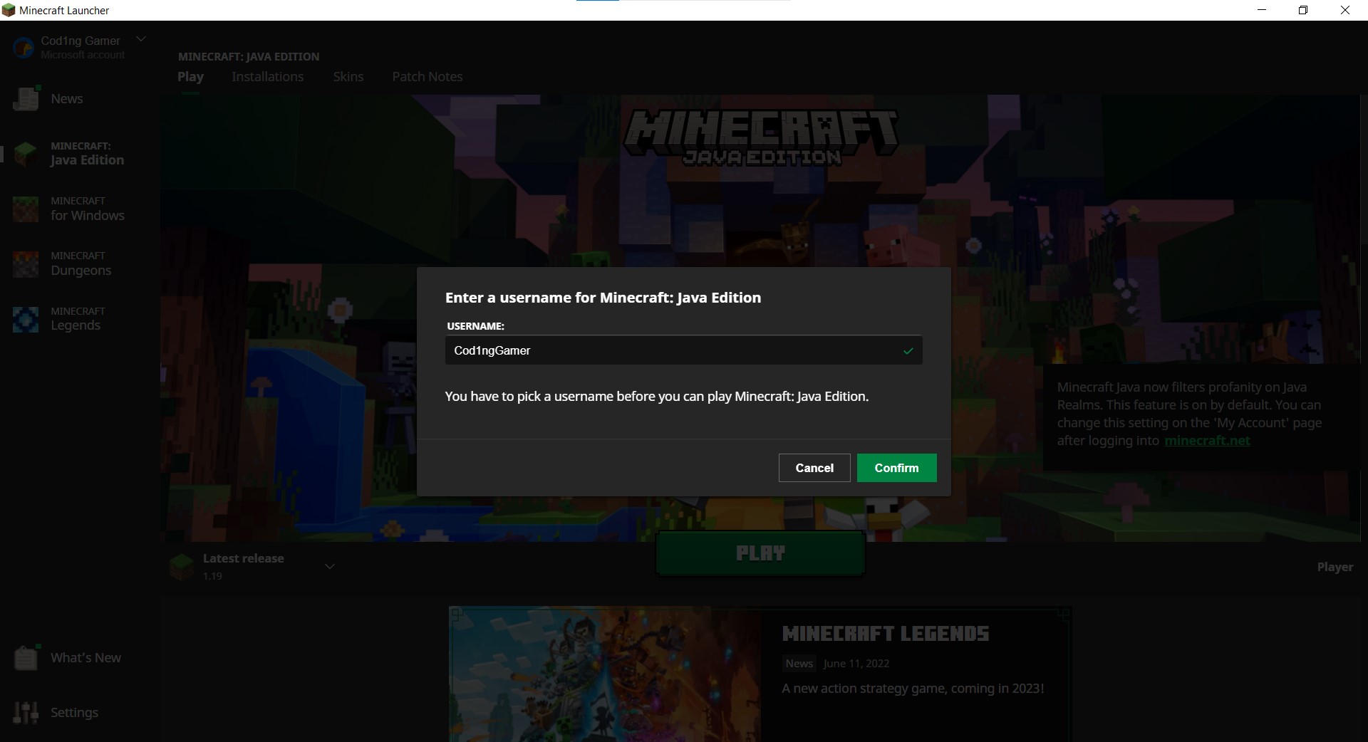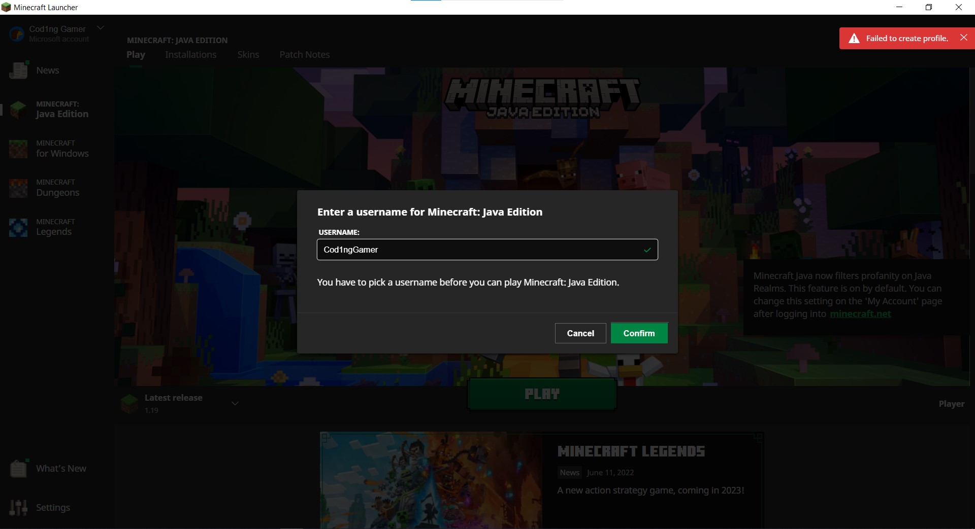 So this bug has been happening to me (on my laptop) for quite some time now, and it's really getting to my nerves. I got Java Edition for free, because I already had Minecraft for Windows, and I entered my username, Cod1ngGamer. It showed that it was valid, so I hit Confirm. Immediately, a red box showed up in the top right, saying there was a problem creating the username. I tried some different usernames, and I just kept getting the same error message OVER and OVER AND OVER.