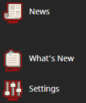 The "What's New" Minecraft launcher icon uses the blurry linear scaling filter compared to the "Settings" and "News" icons which uses the much sharper nearest neighbor scaling filter