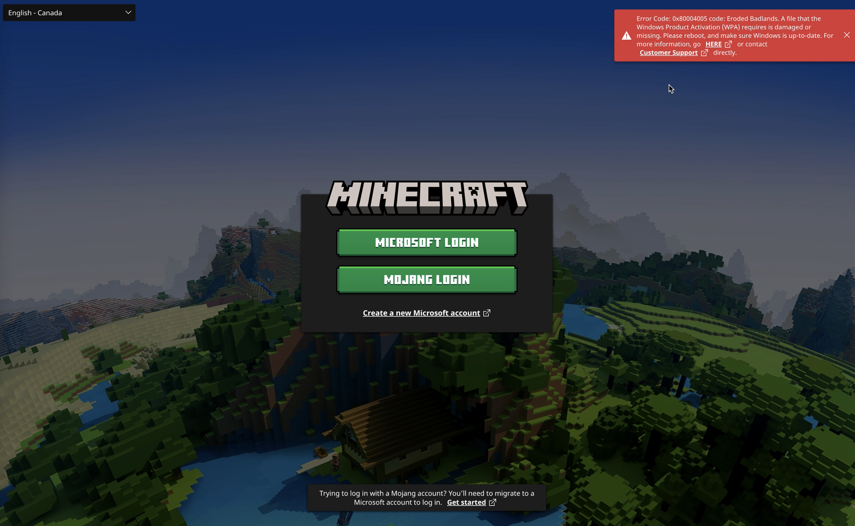 I successfully installed "Minecraft for Mac" and opened launcher application, but when I tried to login (with Microsoft account), the launcher, after showing the loading screen for about 30 seconds, produces these errors. I tried looking up the phrase "Eroded Badlands", as well as the error code "0x80004005", but I found nothing helpful. What is interesting, is that even though I am using the launcher for mac, the error message still mentions that there is a problem with Windows.