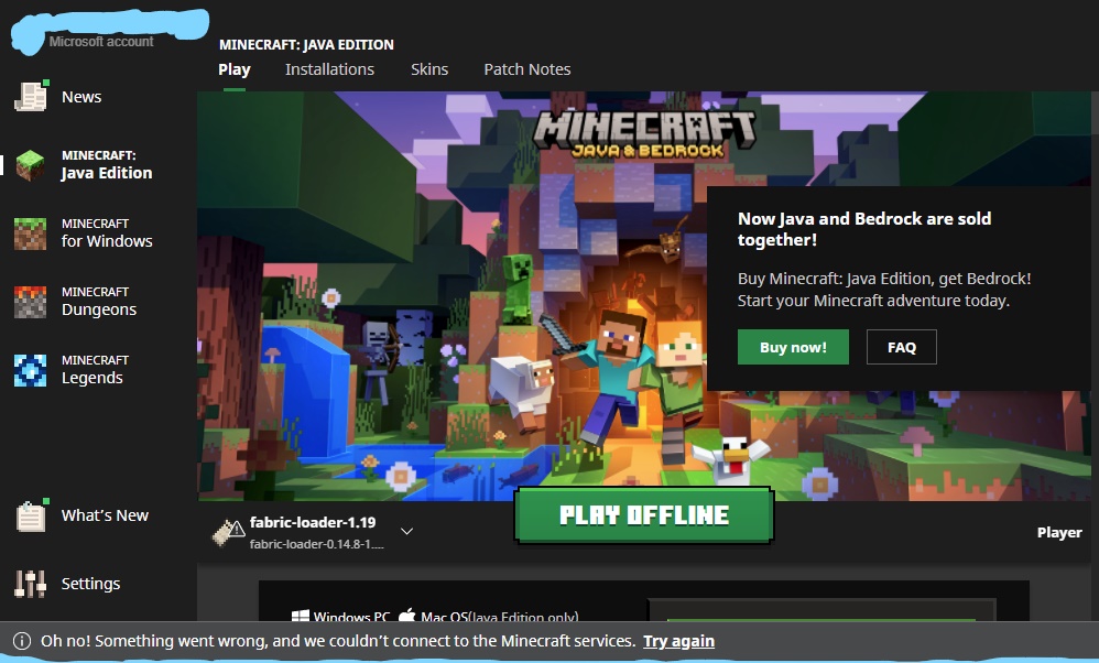 When the Minecraft Launcher is opened, it gives the info tab on the bottom that says, "Oh no! something went wrong and we couldn't connect to the Minecraft services. Try Again"