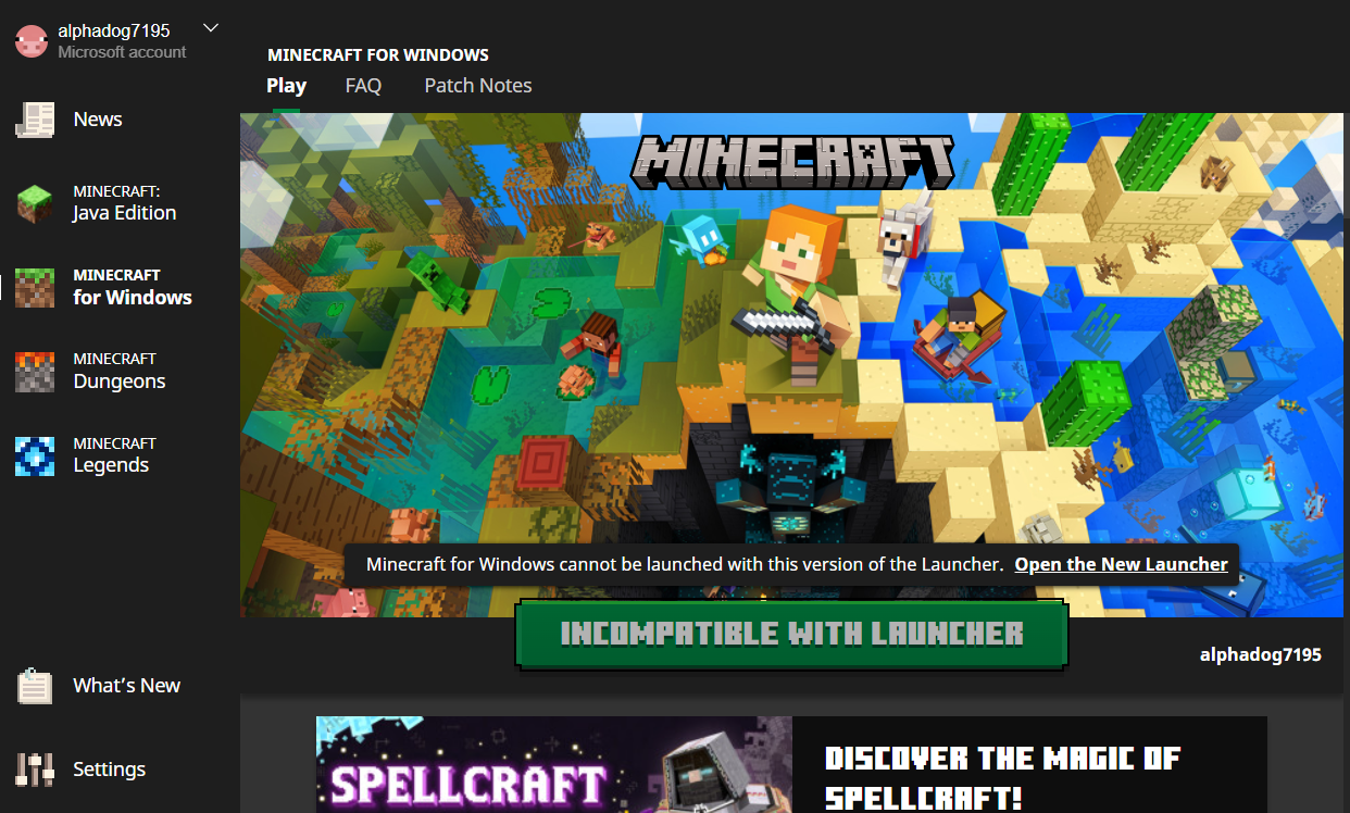 Unable to load Minecraft for Windows. Says I need to open the newer launcher, when I click to open the newer launcher it takes me to the same launcher with the same screen. I've had this problem ever since installing the new launcher, but it has just started working about 2 days ago in this launcher, but today its back to saying I need to newer launcher.