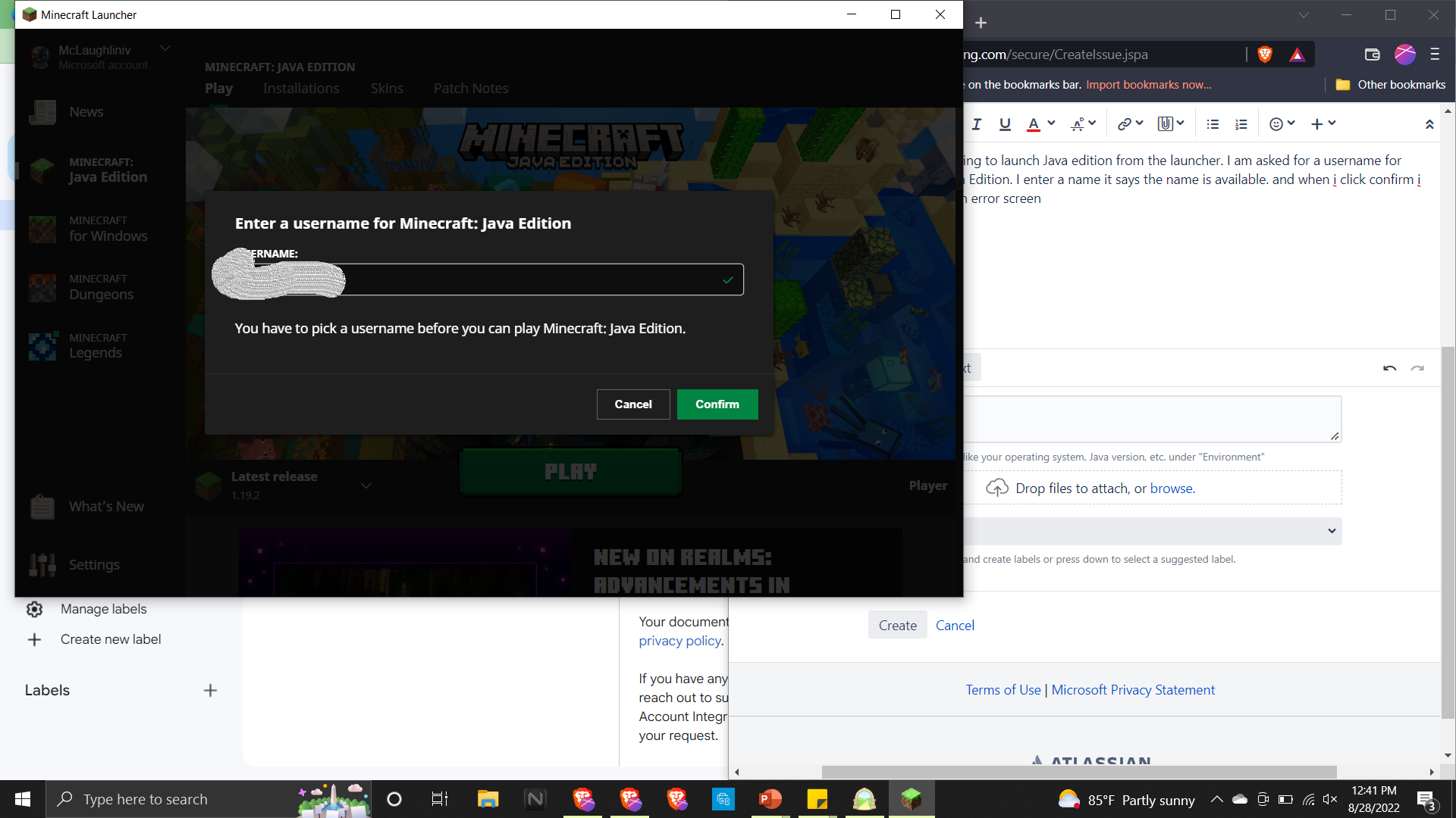 When attempting to launch Java edition from the launcher. I am asked for a username for Minecraft: Java Edition. I enter a name it says the name is available. and when i click confirm i get taken to an error screen