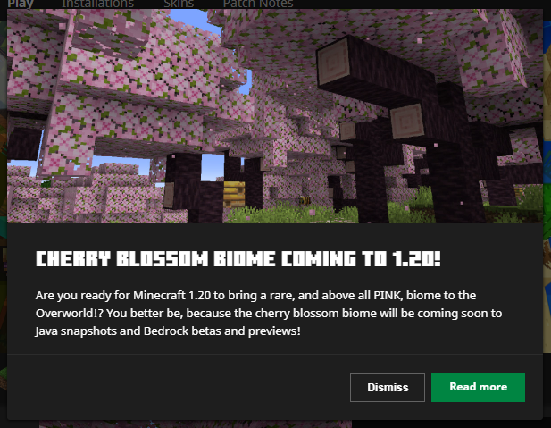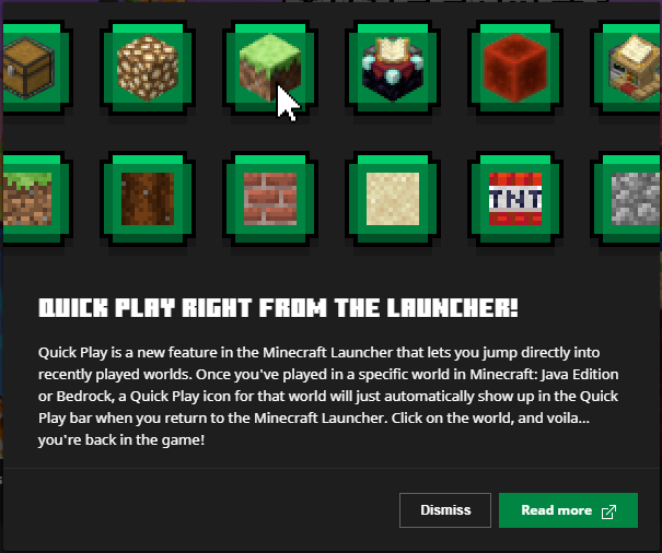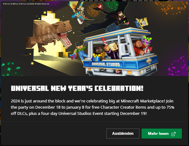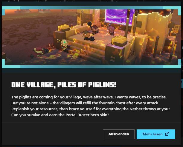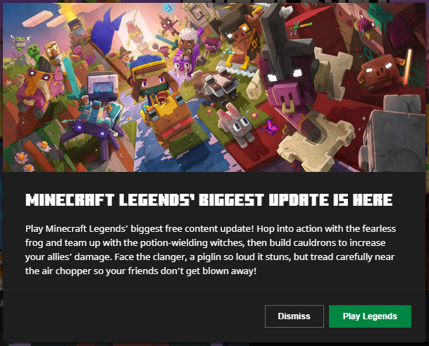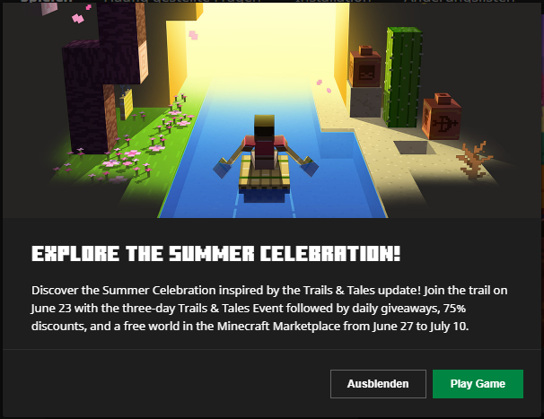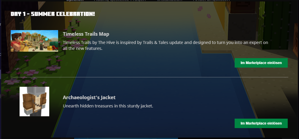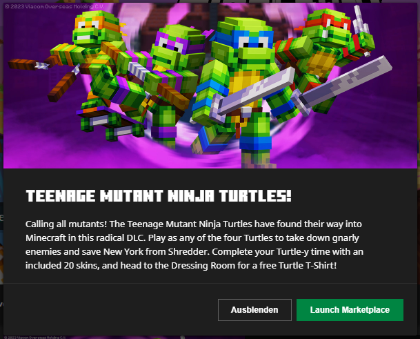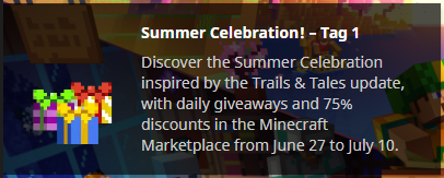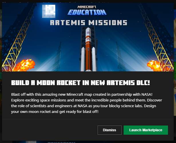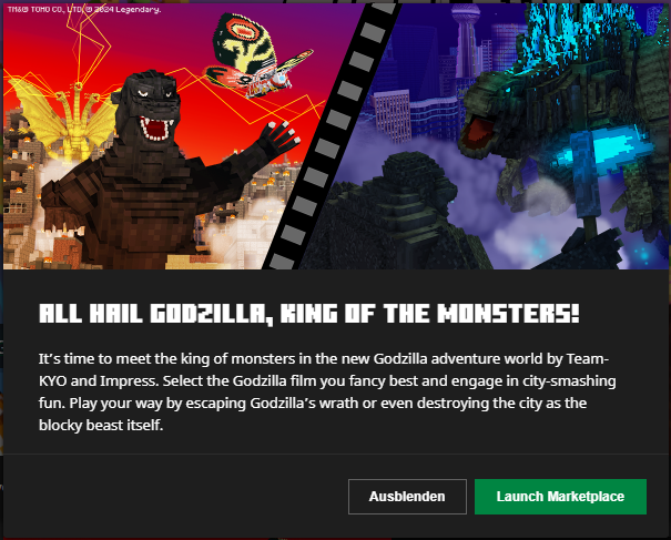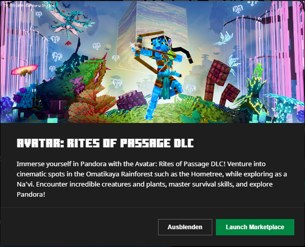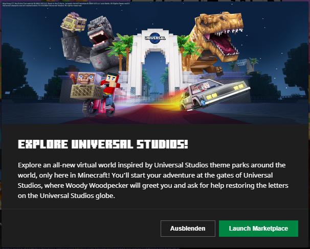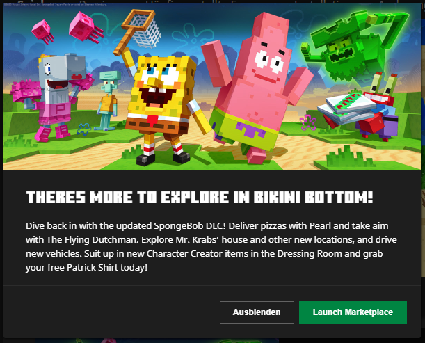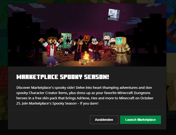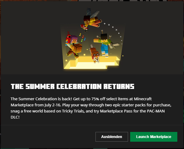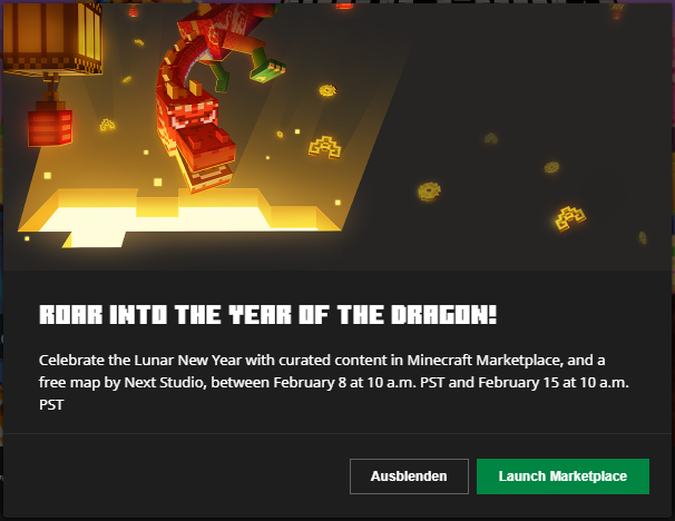 Recurring short-term promotional content in the Minecraft: Java Edition, Minecraft for Windows or Minecraft Legends tab, including buttons such as "Launch Marketplace" (or "Launch Bedrock"), are not translatable.
