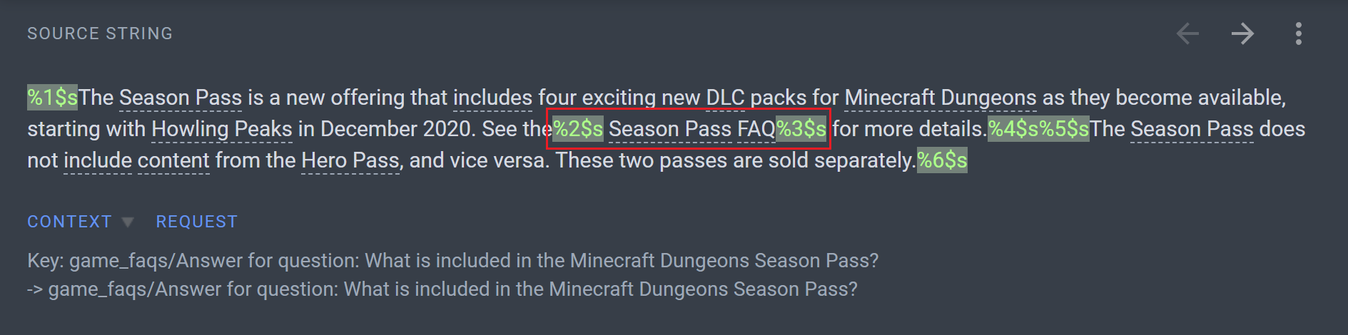 There is a misplaced space character between the variable ("%2$s") and the link text ("Season Pass FAQ") in one of the Dungeons FAQ strings, causing a formatting issue.