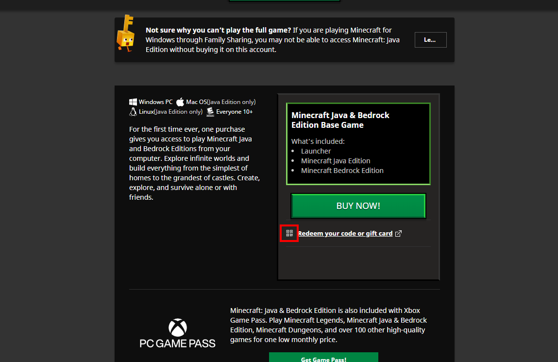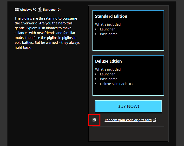 The narrator reads the alt-text "Logotype for Windows" when referring to the redeem icons in the Minecraft upsell sections.