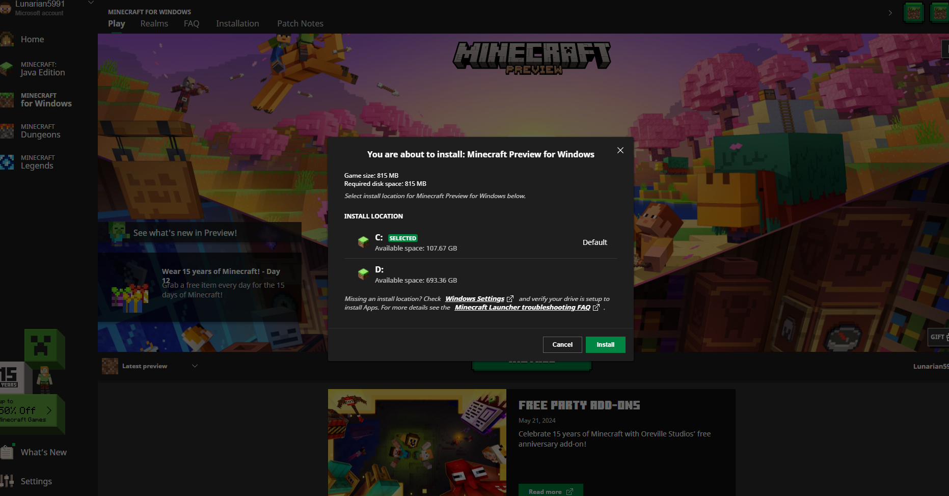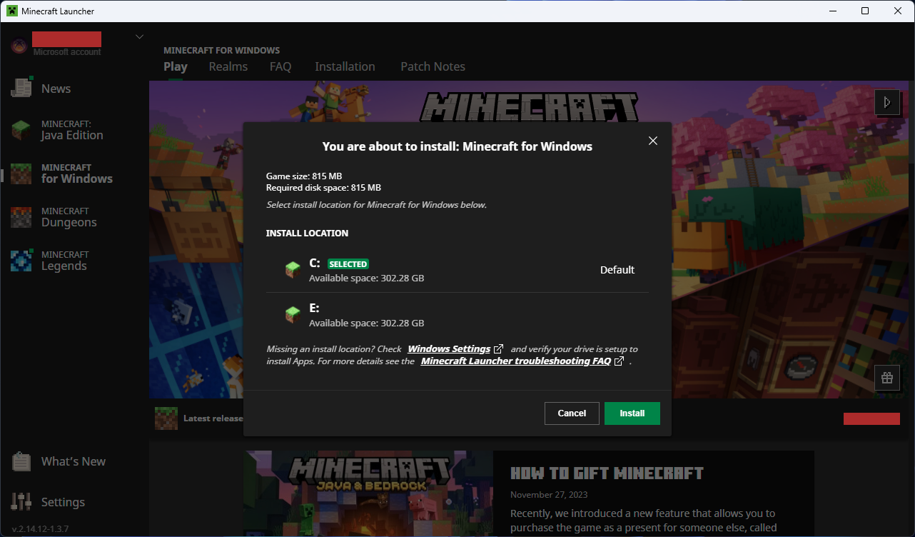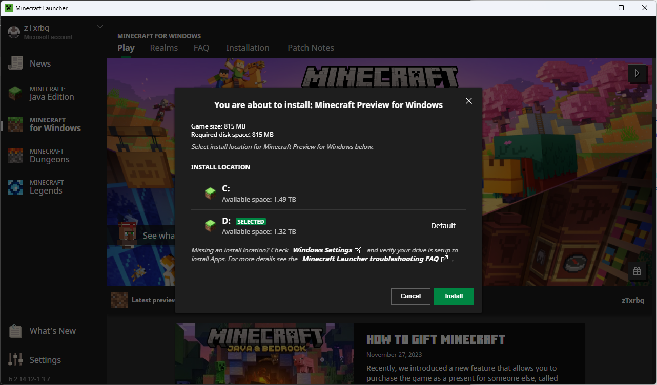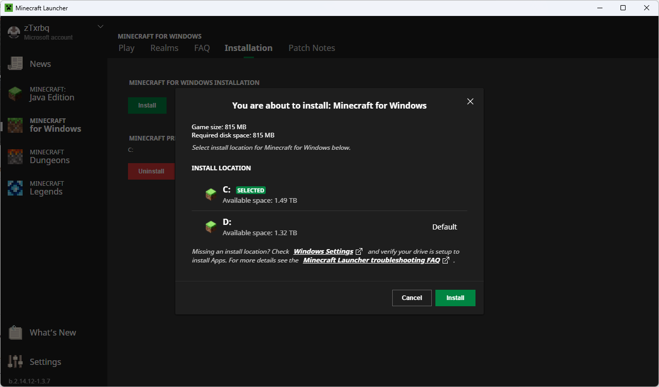 When selecting a location where to install Minecraft: Bedrock Edition or Minecraft Dungeons the launcher shows the same available disk space for all drives. This can be seen in the screenshot below.