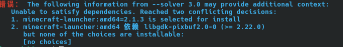 The following information from --solver 3.0 may provide additional context: Unable to satisfy dependencies. Reached two conflicting decisions: 1. minecraft-launcher:amd64=2.1.3 is selected for install 2. minecraft-launcher:amd64 depends libgdk-pixbuf2.0-0 (>= 2.22.0) but none of the choices are installable: [no choices]