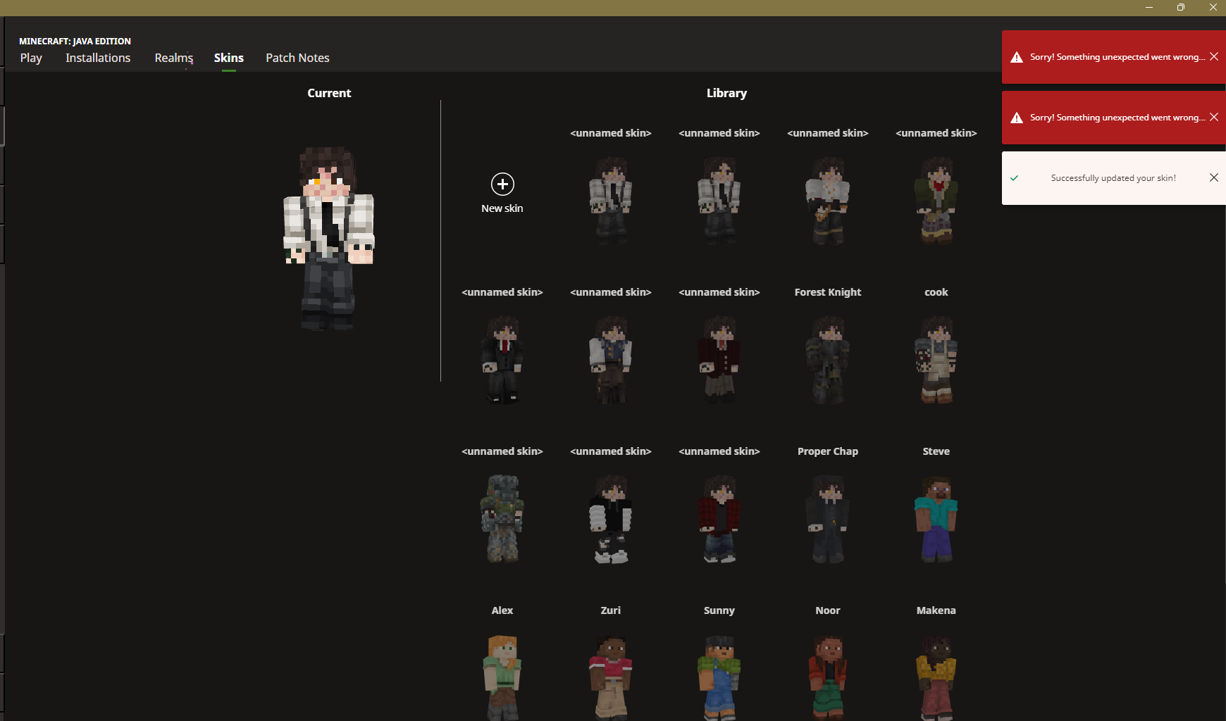 When trying to apply skins through the minecraft launcher or the minecraft website, both don’t want to properly load the skin library up, same goes for trying to apply skins through client mods like essentials, requests to minecraft to apply skins fail constantly, and give errors saying there were connection issues or that issues occurred, however it isn’t a problem with my own wifi or internet as I checked and everything is working at full speed with no issues on that end, something is definitely wrong with minecraft itself.