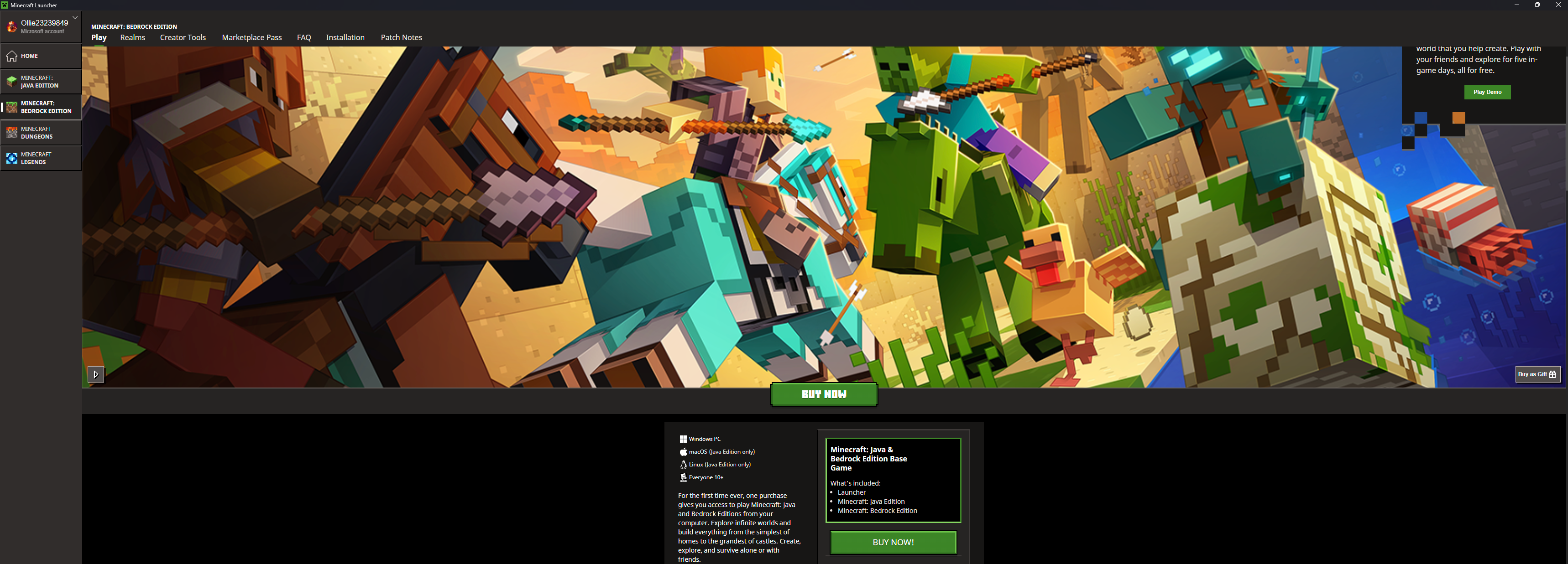 I have got a new pc for Christmas and i wanted to play some Minecraft like I would on my old pc, and I signed in as usual and it said that I haven't got any of the Minecraft games bought when i have bought them previously a while back. I'm not sure how to fix this but my username is Ollie23239849. I'm not sure why this is bugged but if you get back to me ASAP that would be good. Also I'm pretty sure that when I bought bedrock I should have received java to but that could have been before that deal came out.