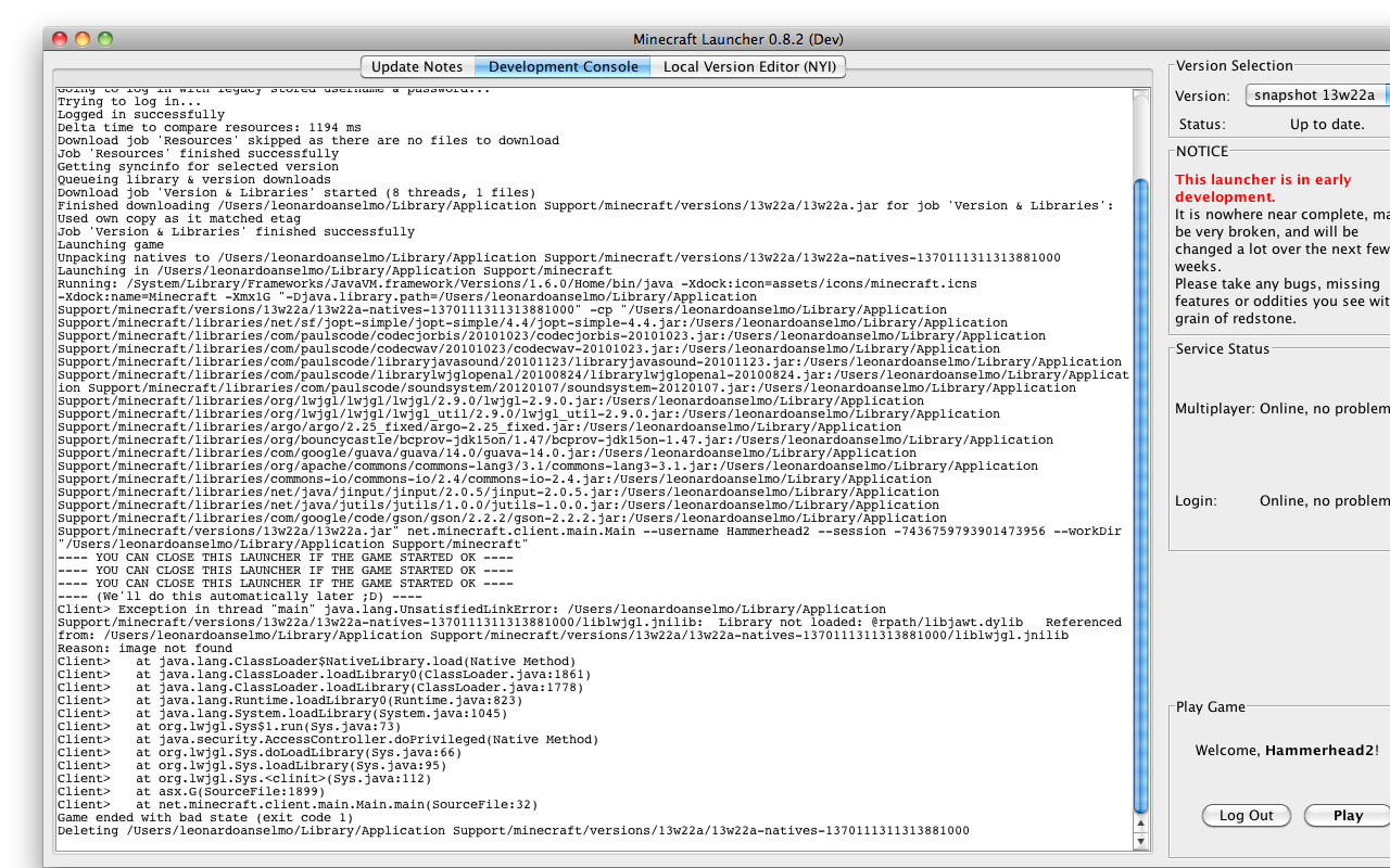 When I hit play, it installs everything, and opens up the game. A few seconds later, the game crashes. Please take a look at the screenshot for the console log.