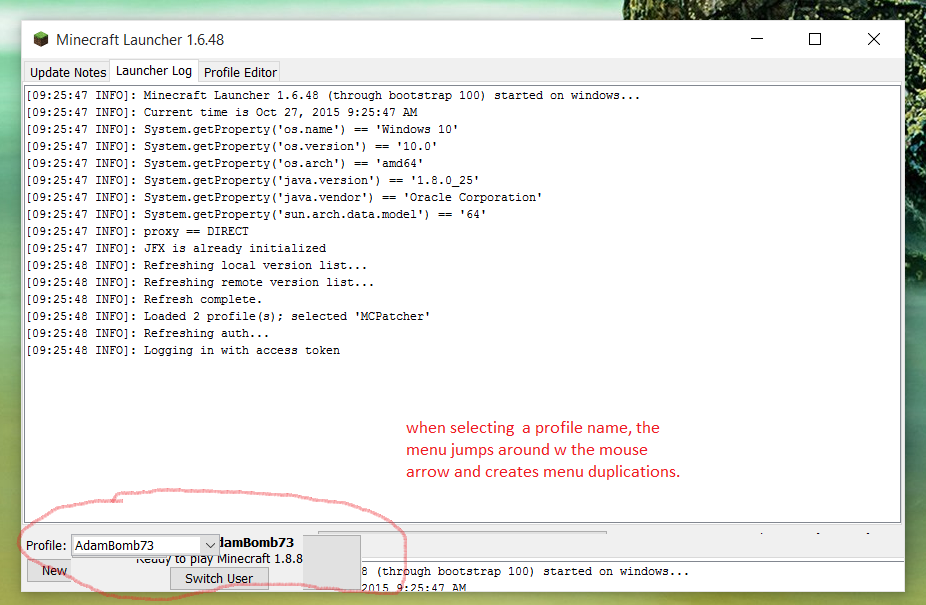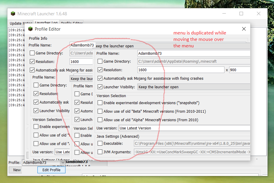 Video clip of the launcher working correctly, then begins to have visual corruption when the "Profile:" drop-down box is used.