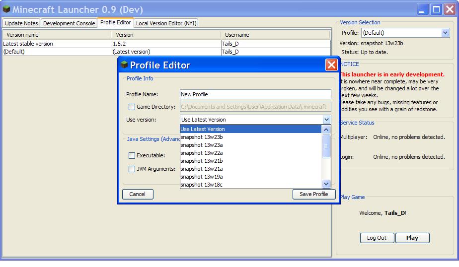 there isn't an option to change my game version, just to change my profile. The launcher version is 0.9. I can only play 13w23b