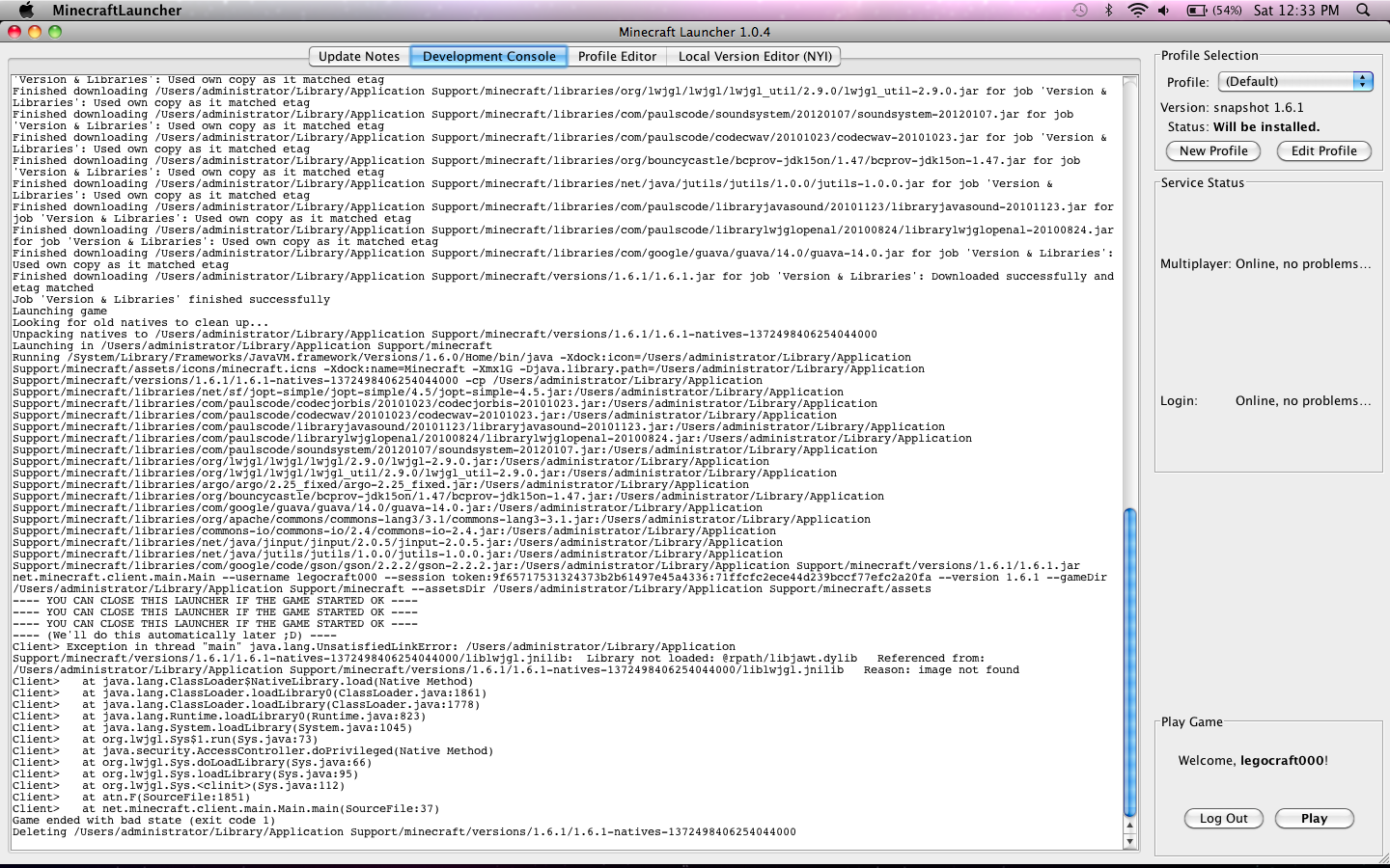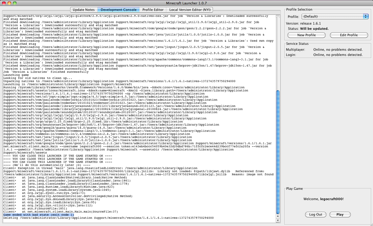 When i downloaded the Minecraft 1.6 new launcher on both 1.6 and 1.6.1, i start it and it says "Game ended with bad state code (exit code 1). Then it doesn't open minecraft. This was not on the snapshots, this was the actual Pre-Release of Minecraft 1.6.