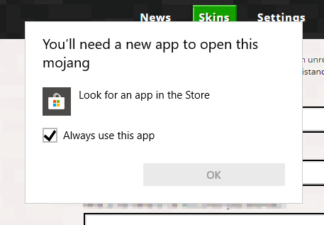 When going to the Skins tab, it prompts me to a security verification. The verification fails despite the information entered being correct. I click "Need Assistance?" which then pops up the Windows 10 prompt for "You'll need to open this app with mojang" and it doesn't know and cannot find an app called 'mojang'.