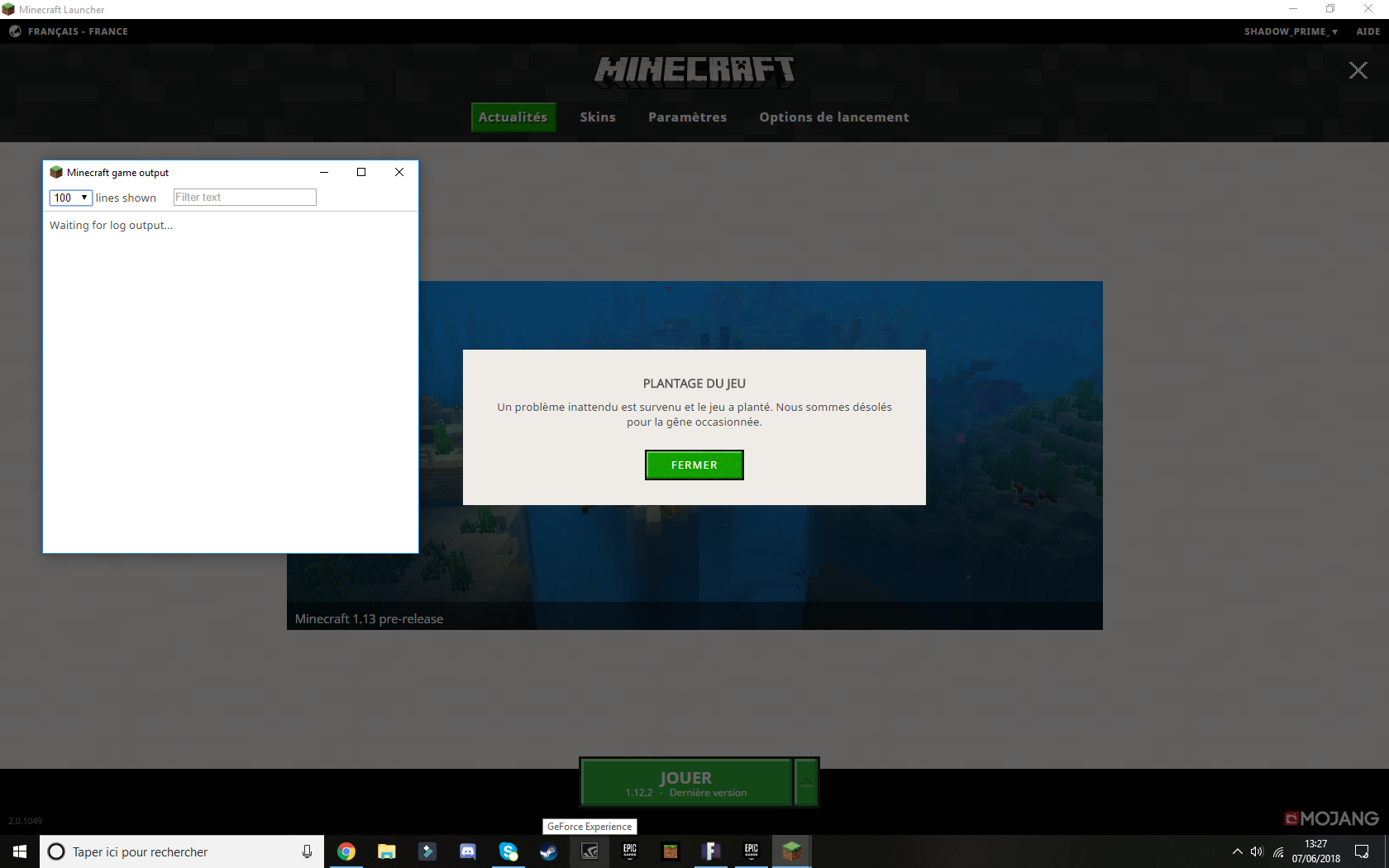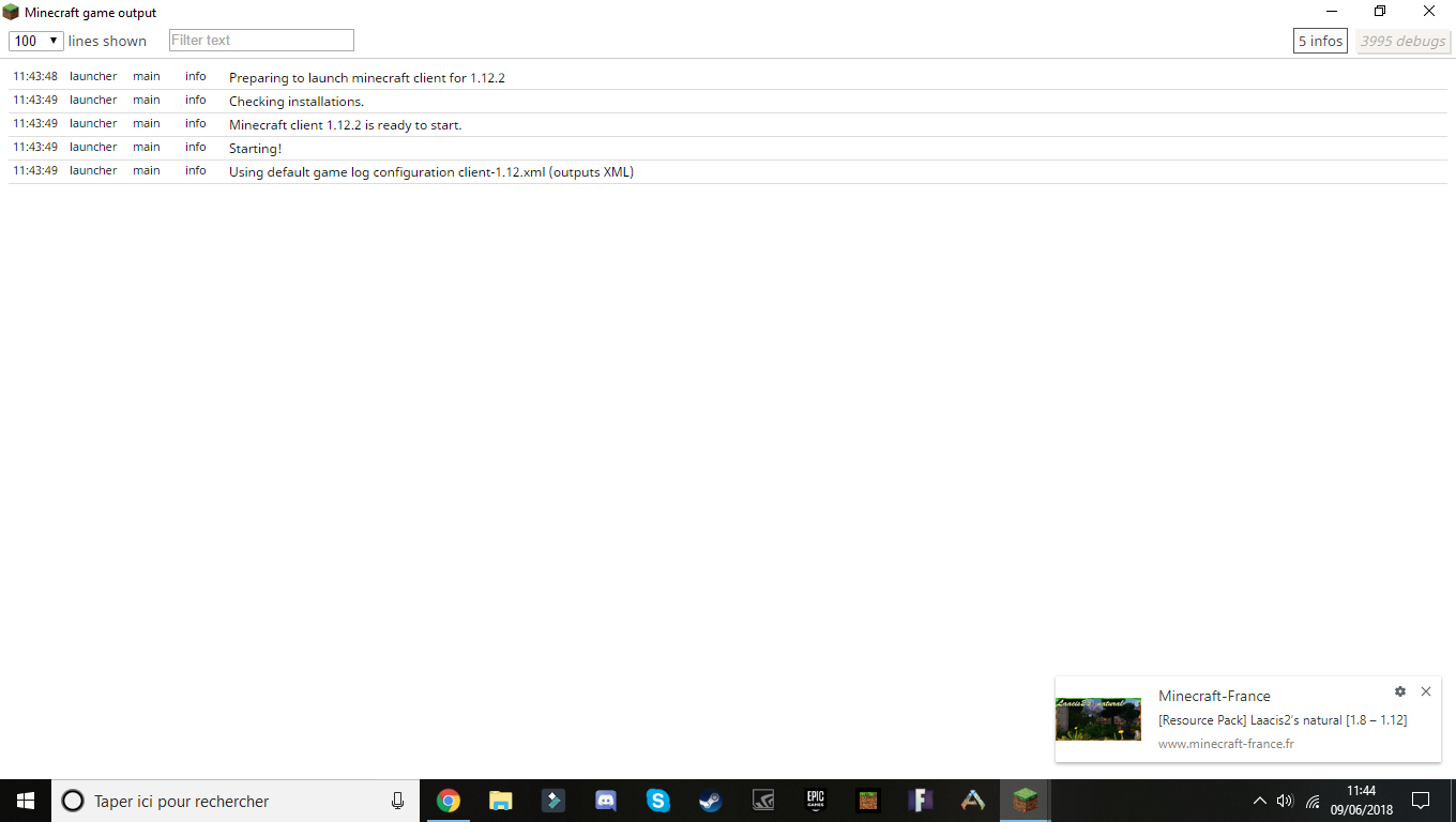 quand je clik sur joué minecraft gamme output s'ouvre et le message d'erreur me dit