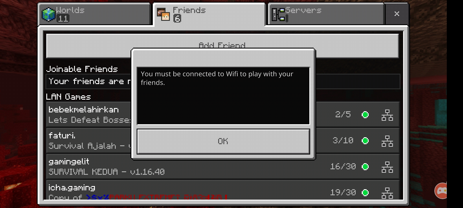 I cannot join server and friend i'm using data cellular but still say "You Must use WiFi to play with friend" please fix this i click the "Use data cellular" but still cannot join please fix it now before the update i can play it but after update i can't play with my friend