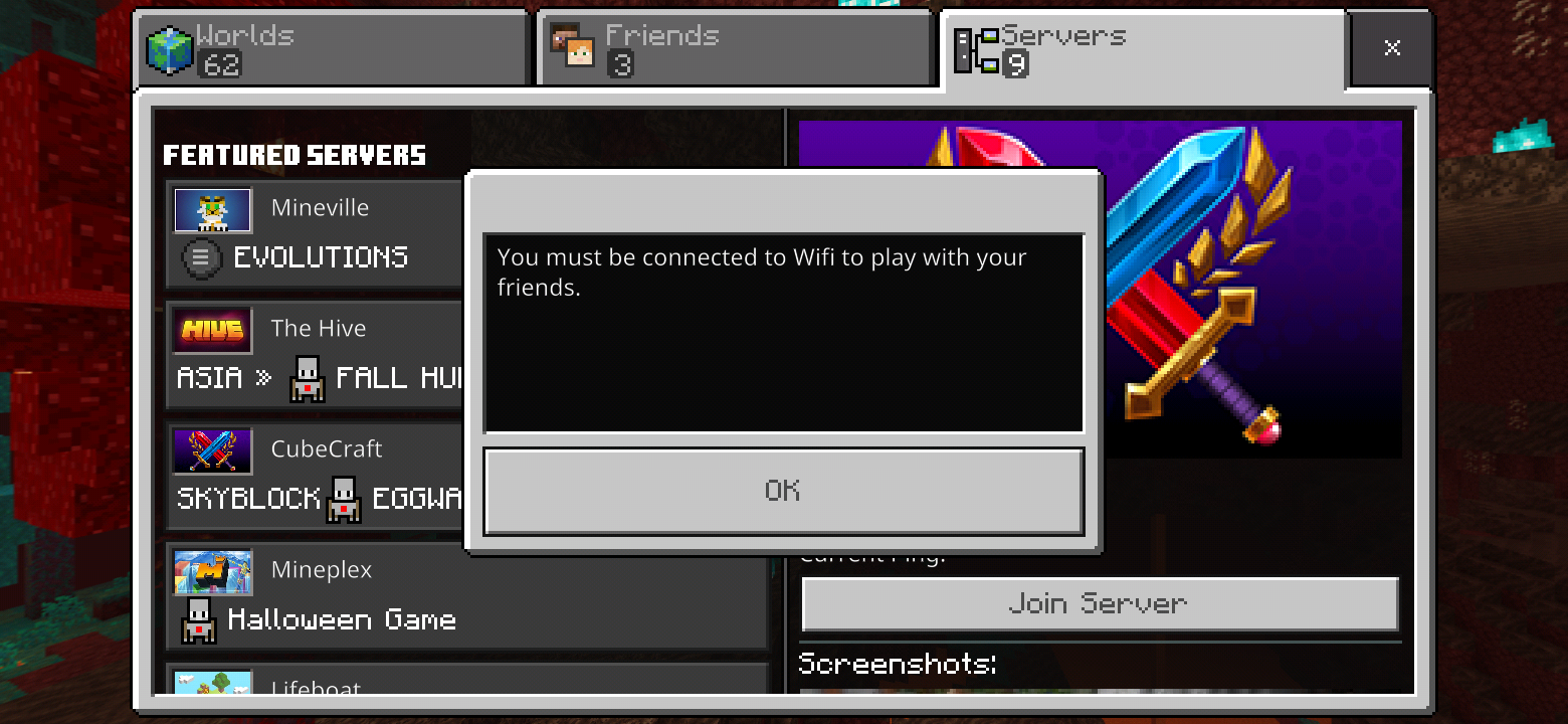 I can't play with my friends using mobile data and I can't join servers using mobile data fix it fast after update I can't even play .update is dumb so please fix it and I did have my cellur data on on setting