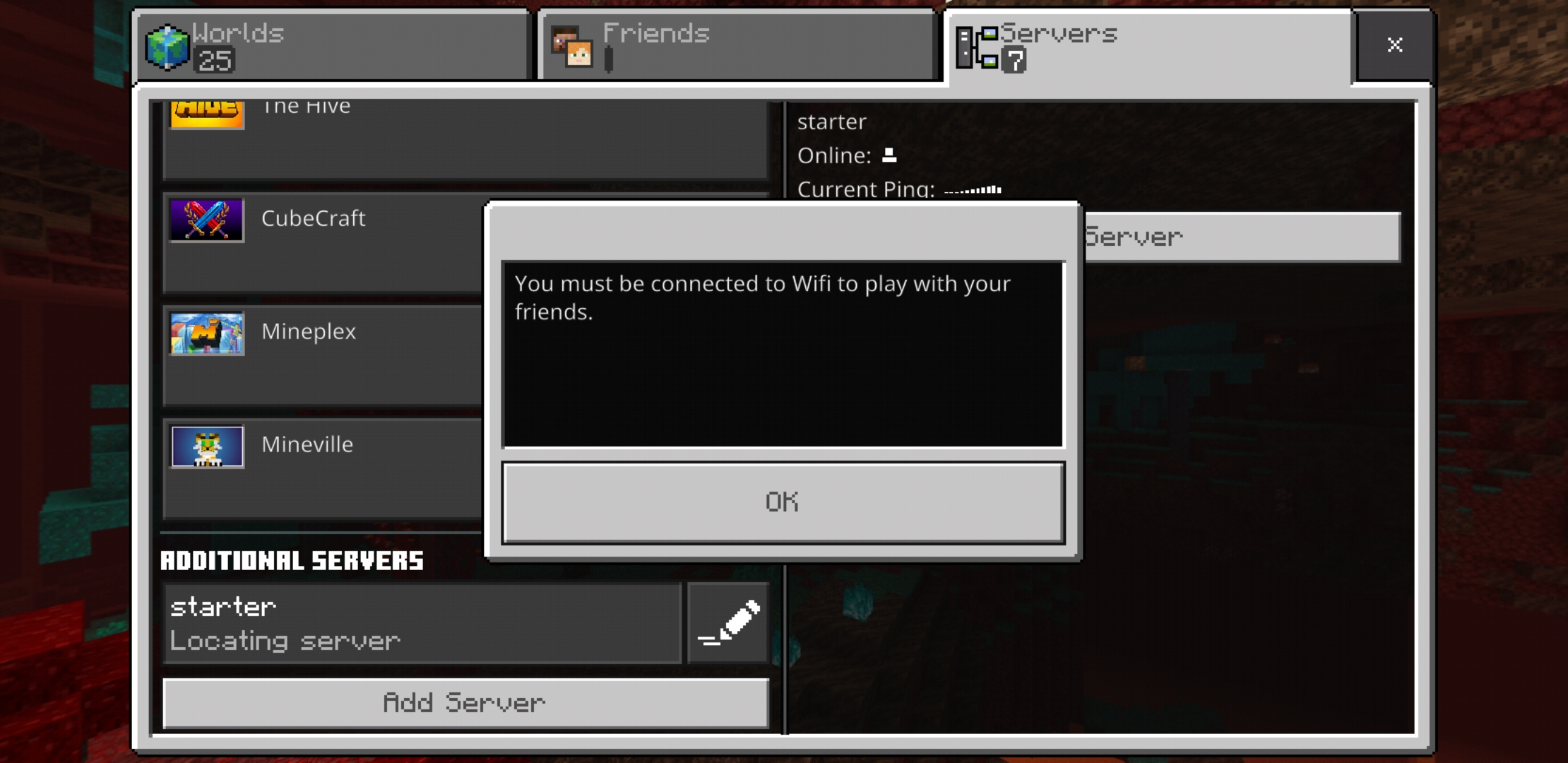 So every time I want to play multiplayer minecraft it says I need wifi to play but I have enabled play with celluar data.i turned it on and off and reseted my phone but I wont still wokr