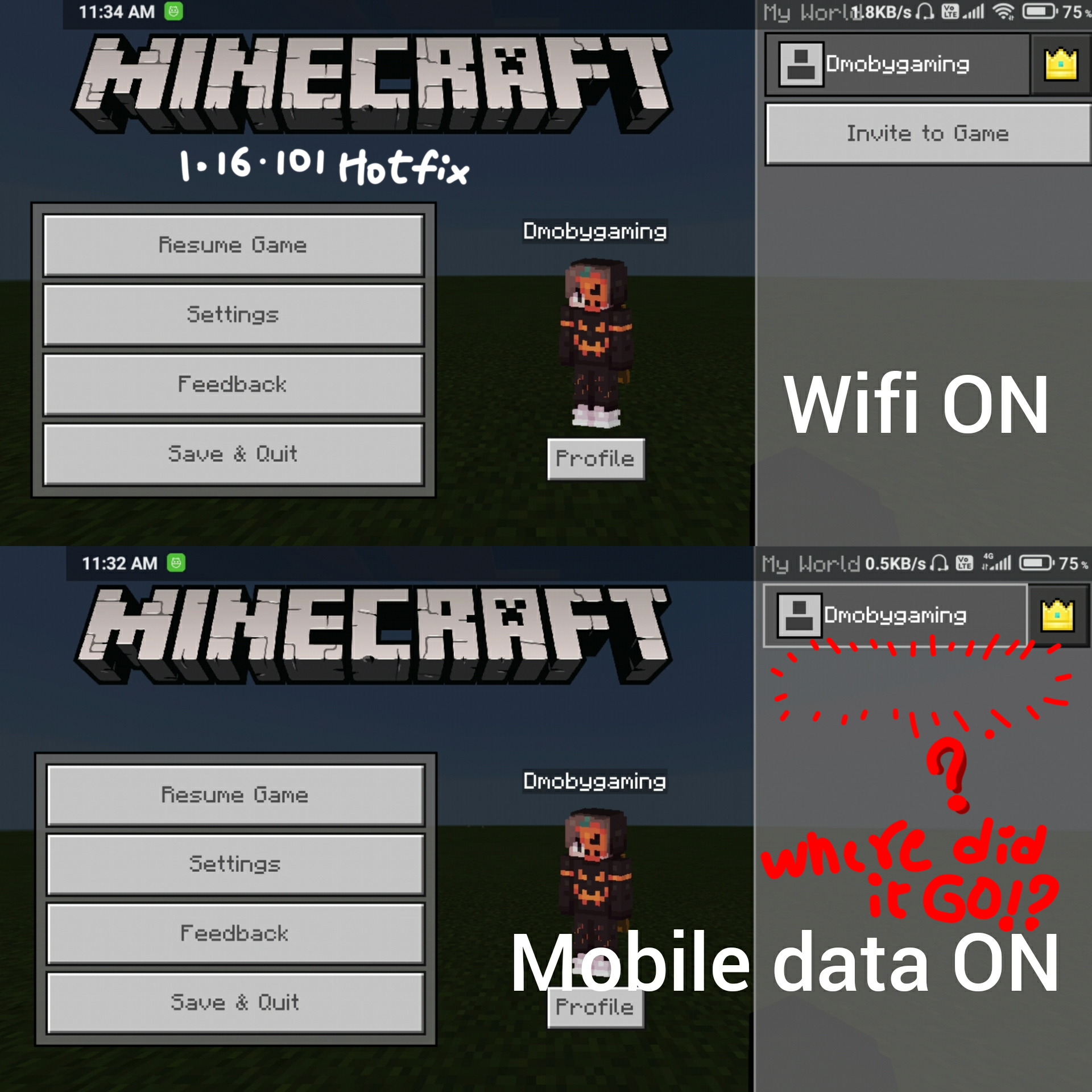 The "invite to game" button magically disappears when you switch form WiFi to Mobile data you can't invite players to your world when you are using Mobile Data if it's a mobile version of the game you should be able to play it from anywhere but WiFi isn't available everywhere!!.