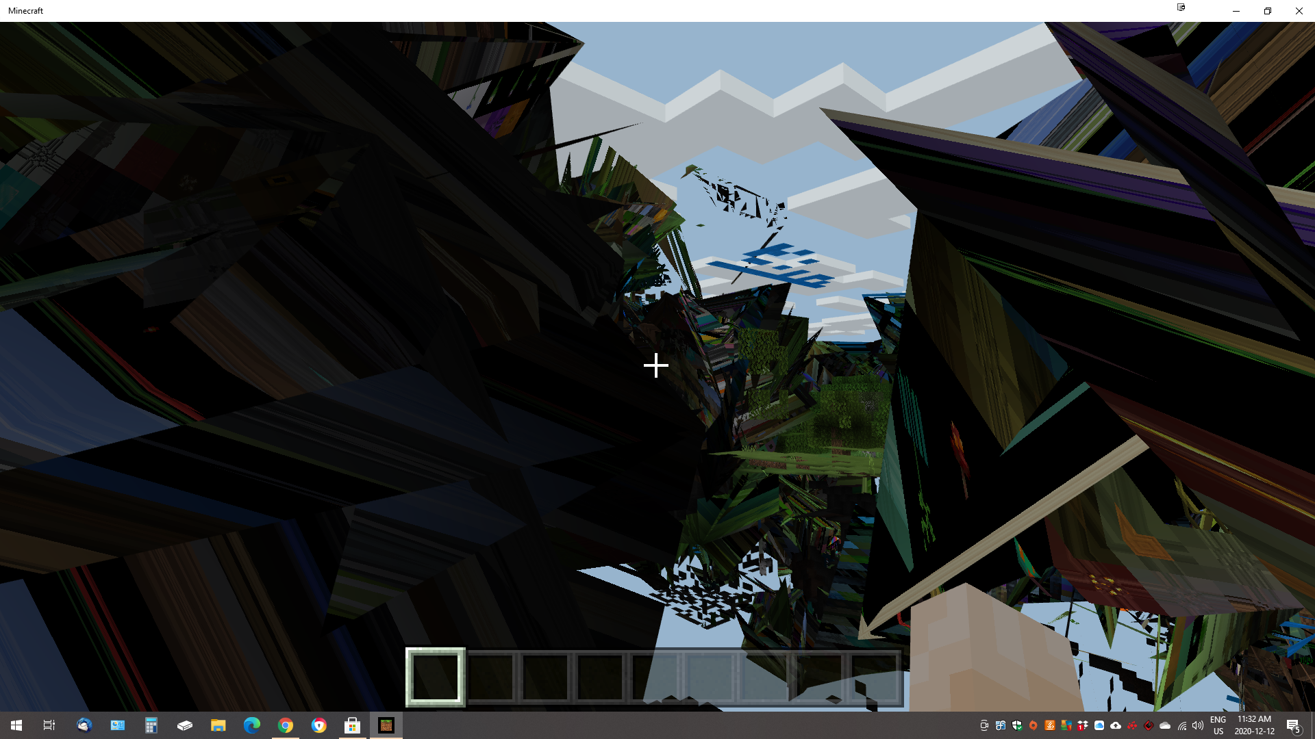 I am unable to see the menu when game loads and when I get a world to load by randomly clicking on the screen, it looks like the attached screen shot. I tried uninstalling and reinstalling and now I can't see the worlds that my daughter created. Tried to create a new world and everything is all jumbled. It's the windows 10 version that I bought from the windows store