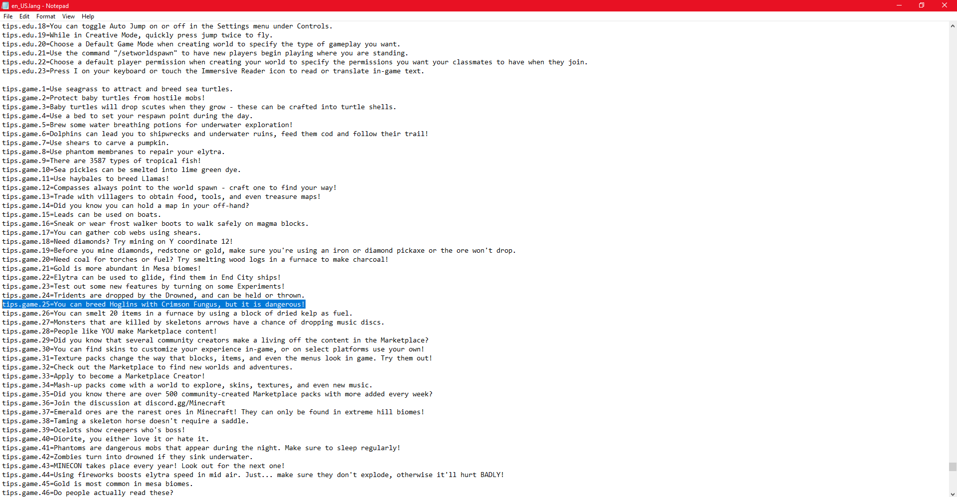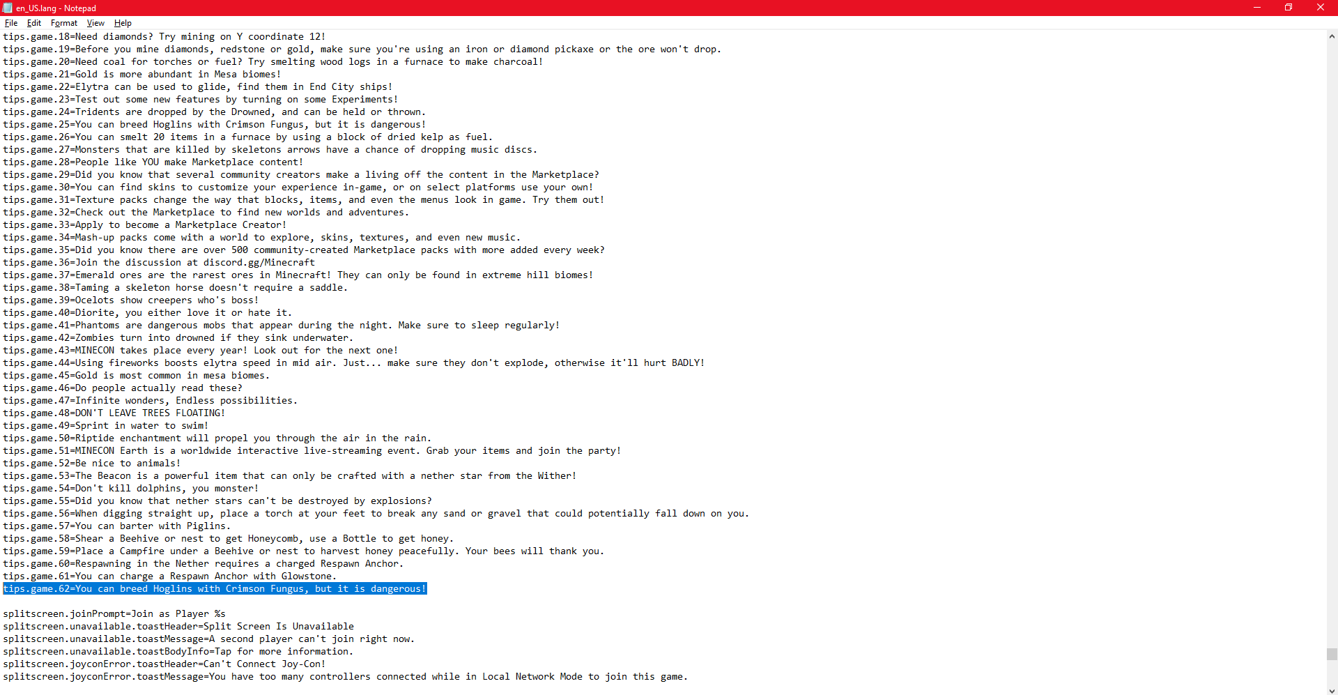 Duplicated Loading screen Tip. The Loading screen Tip is "You can breed Hoglins with Crimson Fungus, but it is dangerous! It appears in: tips.game.25 & tips.game.62