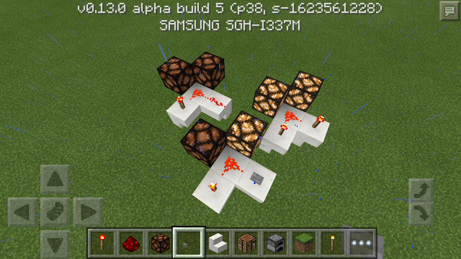 In the image, there are 3 setups of redstone dust "L" corners powering two redstone lamps. In each setup, there is air below the lamps and the inverted quartz stairs that support the redstone stuff. In each setup, different lamps receive power.