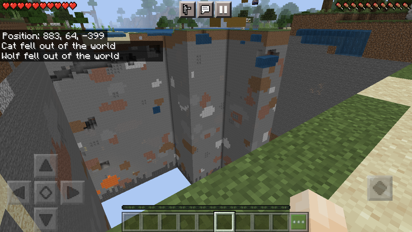 I have had an infinite peaceful survival world for a few weeks now. I opened my game today and immediately "fell off" the edge of my world. I exited the game and assumed it would go away if I rejoin the world. I spawned where the original world spawn is and had to travel all the way back to the coordinates of my base but nothing was resolved. The entire area of my house (mine, farms, gardens, etc) is completely gone and I got the messages that my dog and cat fell out of the world. I have tired to restart my phone, exit the game but nothing is working. The surrounding areas seem to be unaffected, it appears that only the places I've built are disappearing.