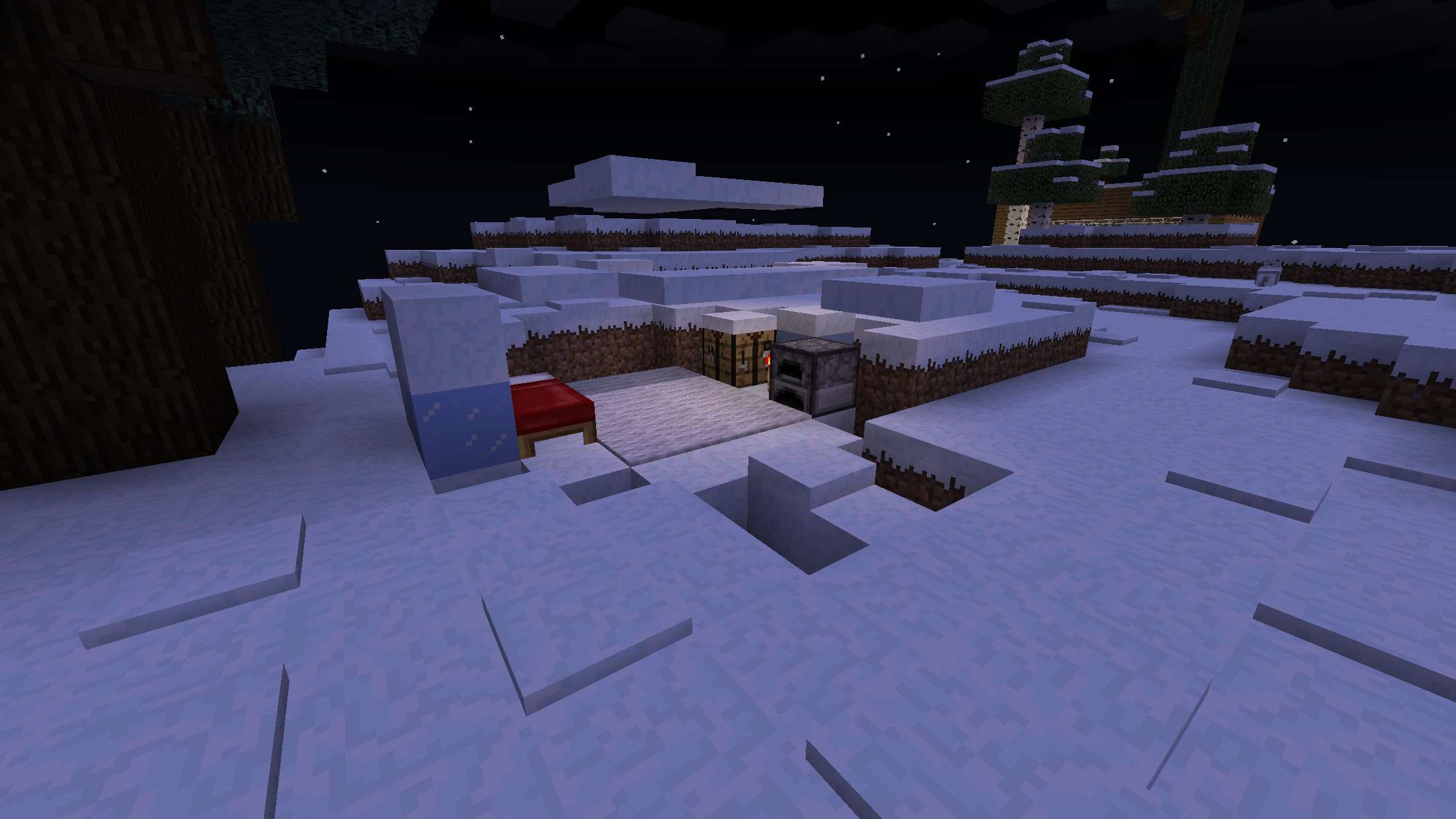 Shown is a player-built igloo in an ice plains biome (old-type world), before and after the snow blocks were replaced, in addition to a newly generated ice plains spikes biome (infinite world).
